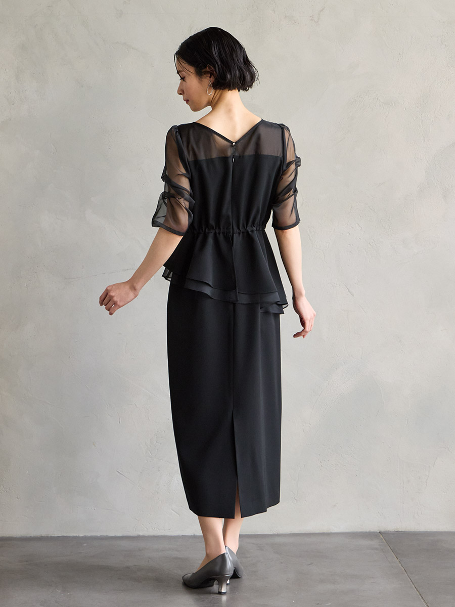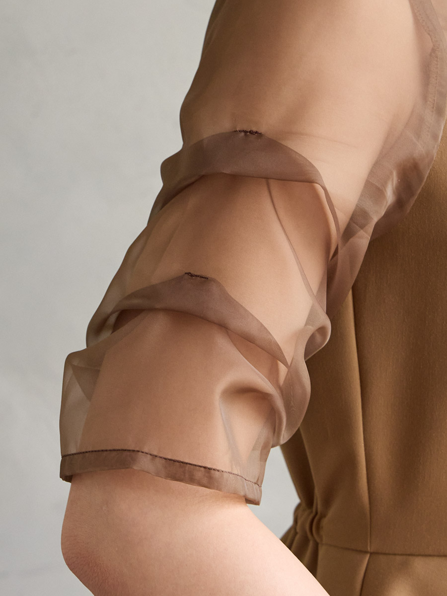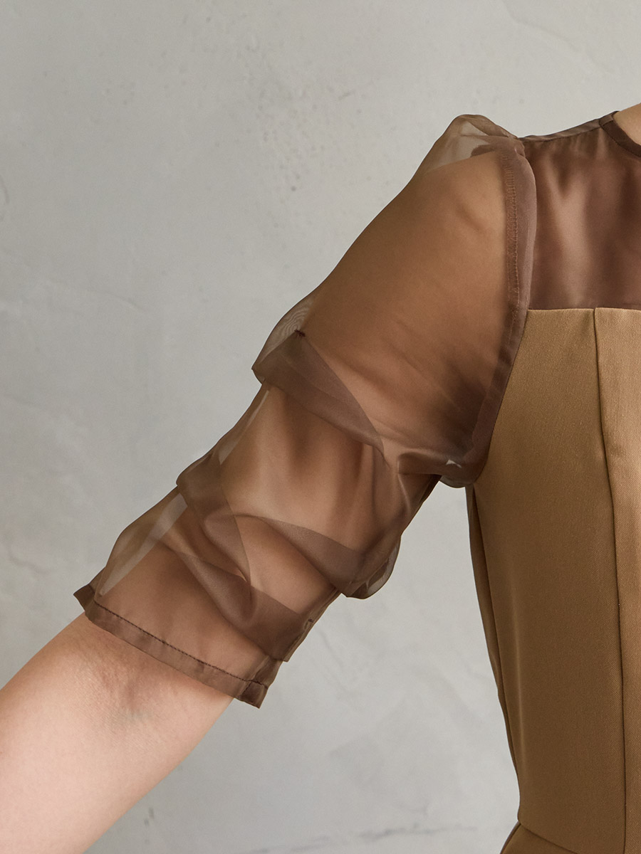 デコルテと袖部分はオーガンジーの透け感がありヘルシーな肌見せもありつつ、袖のタックデザインが腕周りをしっかりカバーしてくれます。
