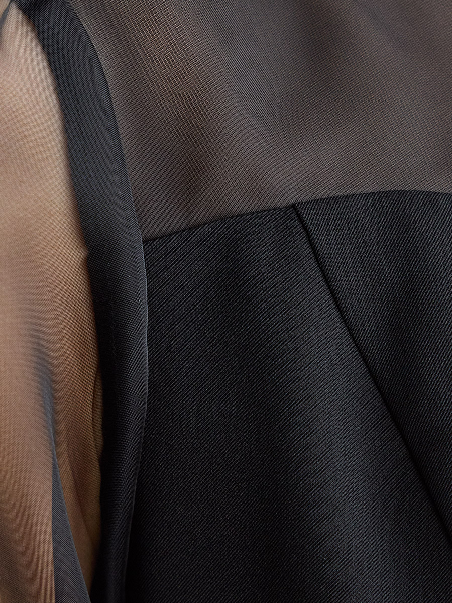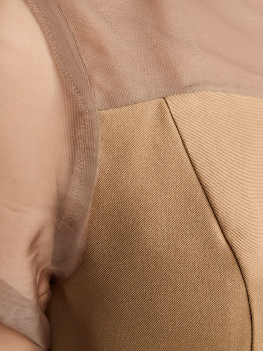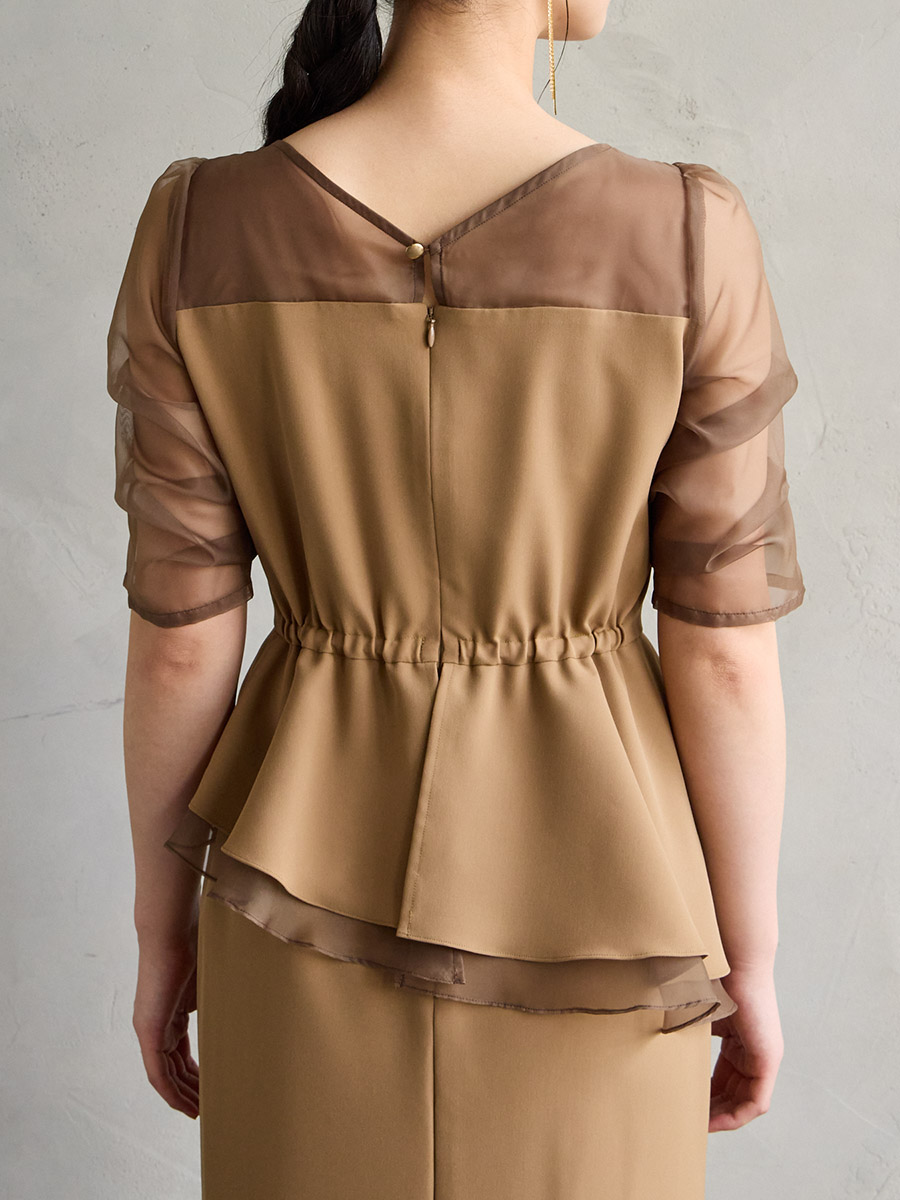 デコルテと袖部分はオーガンジーの透け感がありヘルシーな肌見せもありつつ、袖のタックデザインが腕周りをしっかりカバーしてくれます。