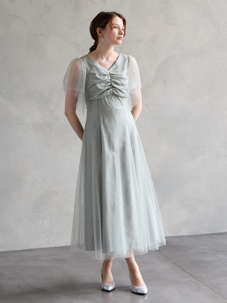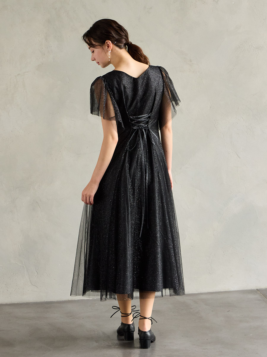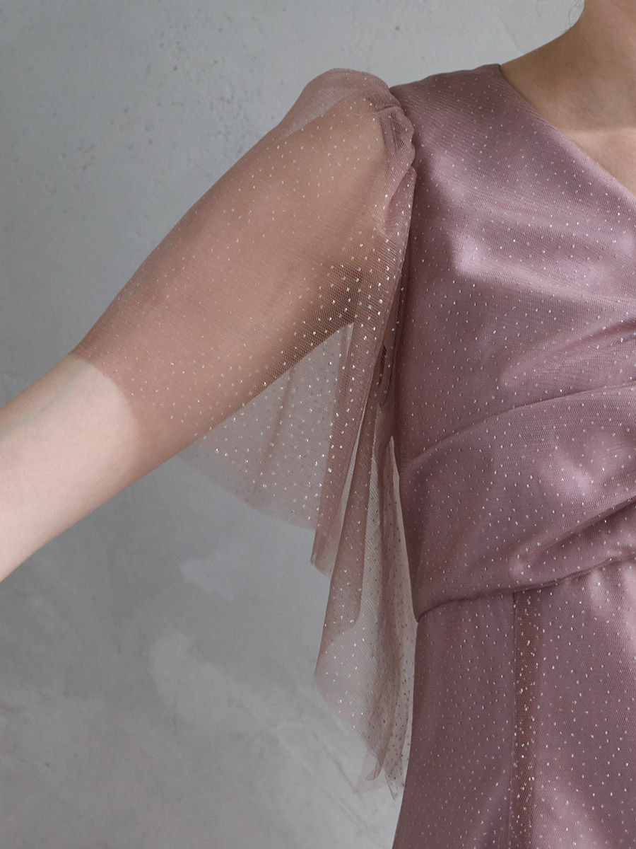 ・グリッターチュールと無地チュールを重ねたフレアスリーブが二の腕を程よくカバー