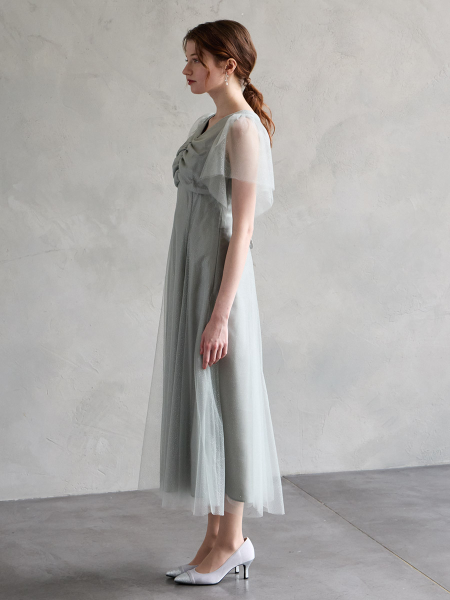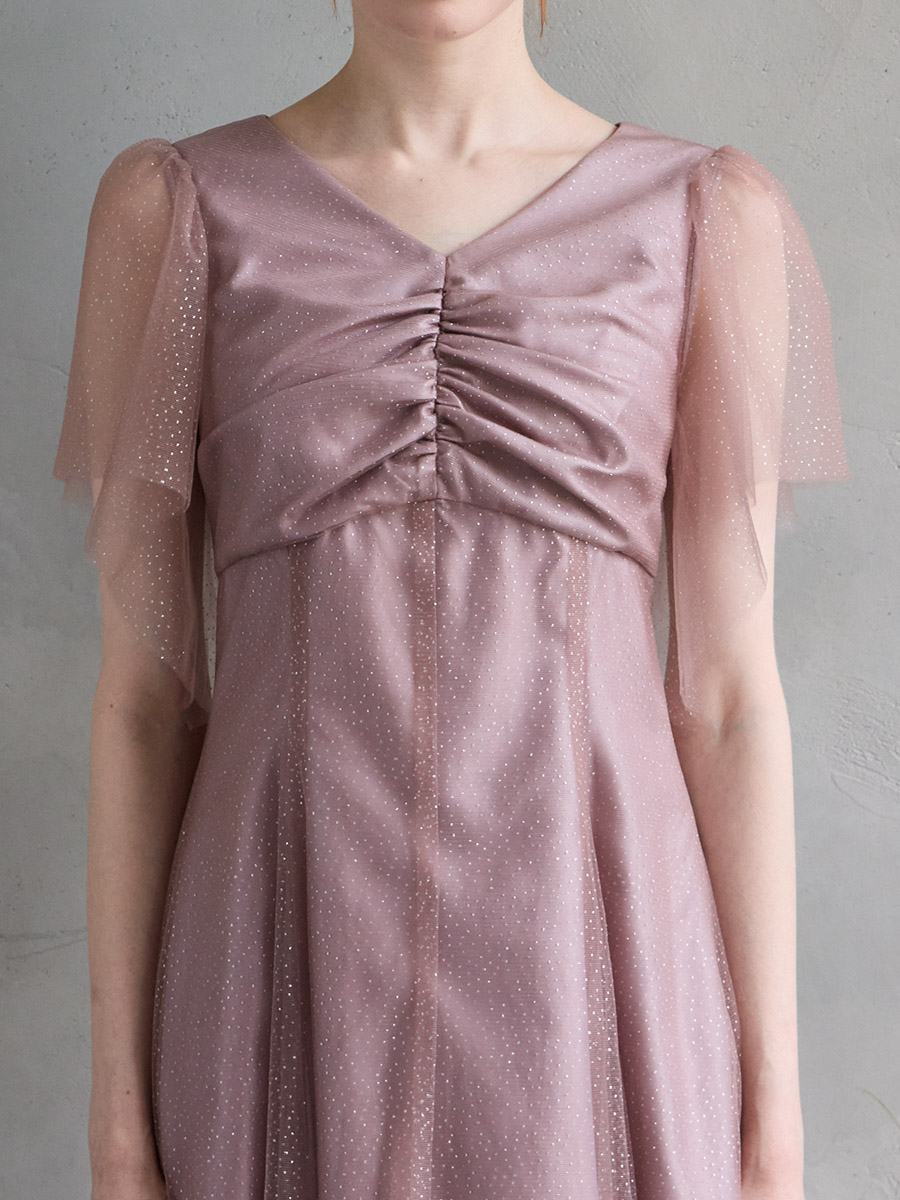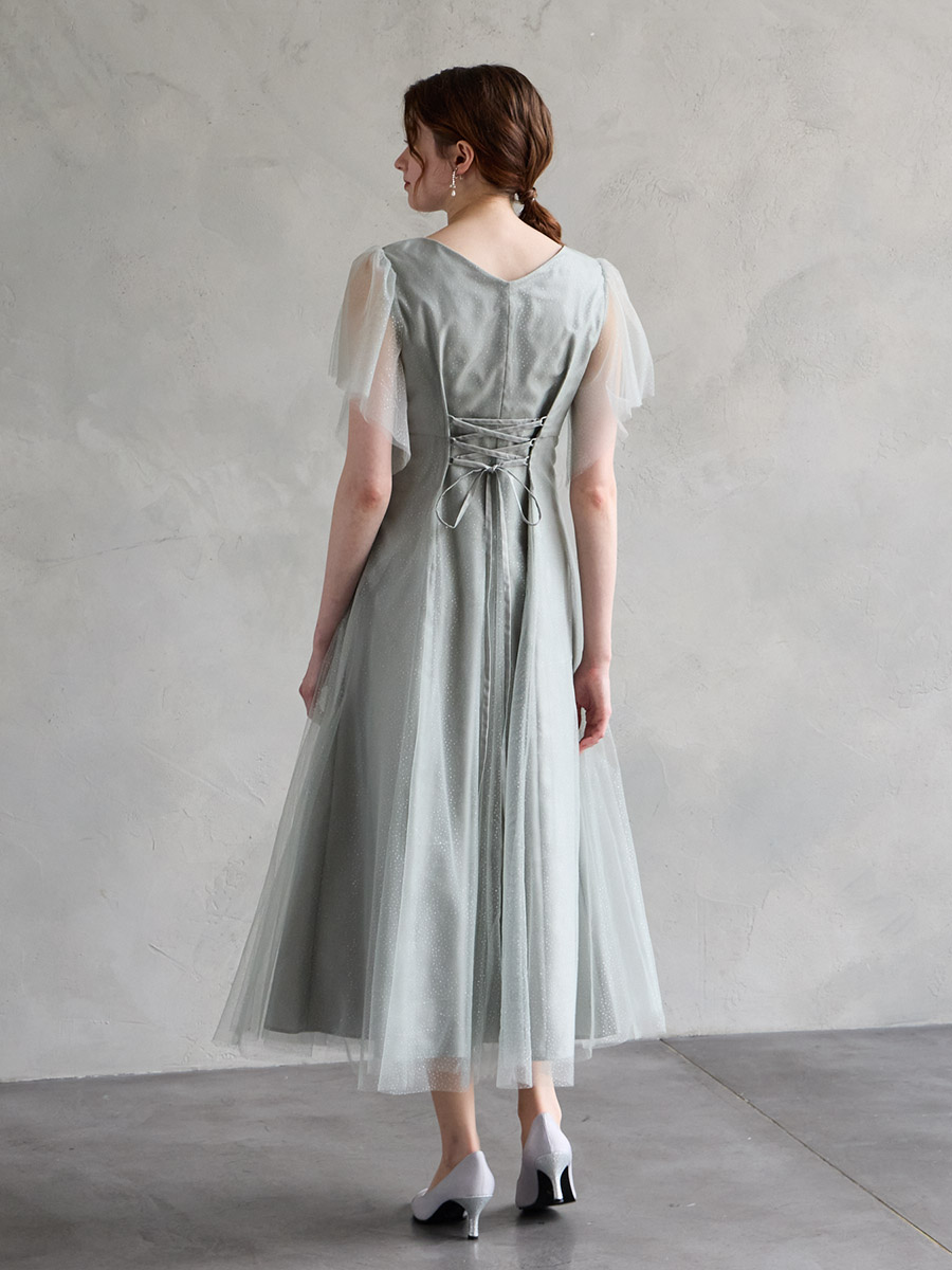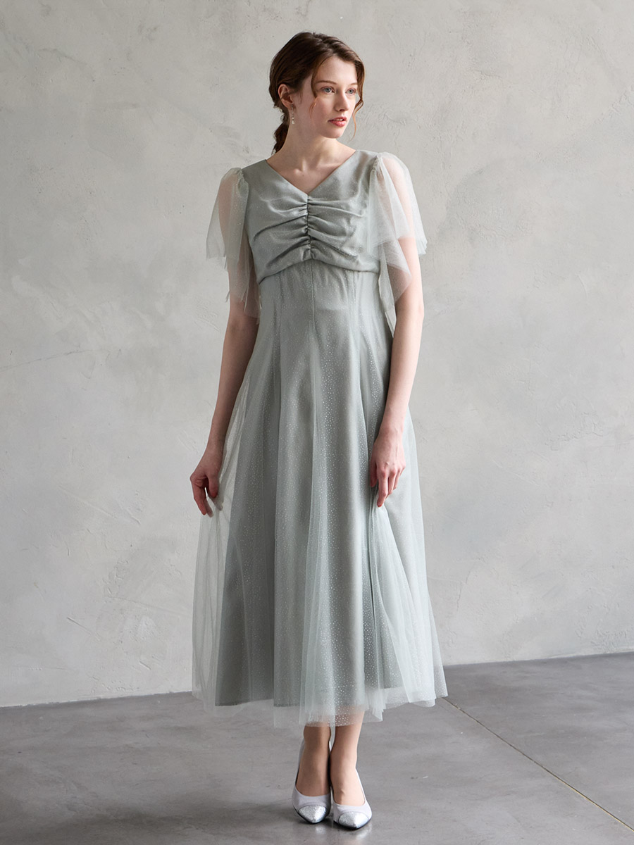 ・グリッターチュールと無地チュールを重ねたフレアスリーブが二の腕を程よくカバー