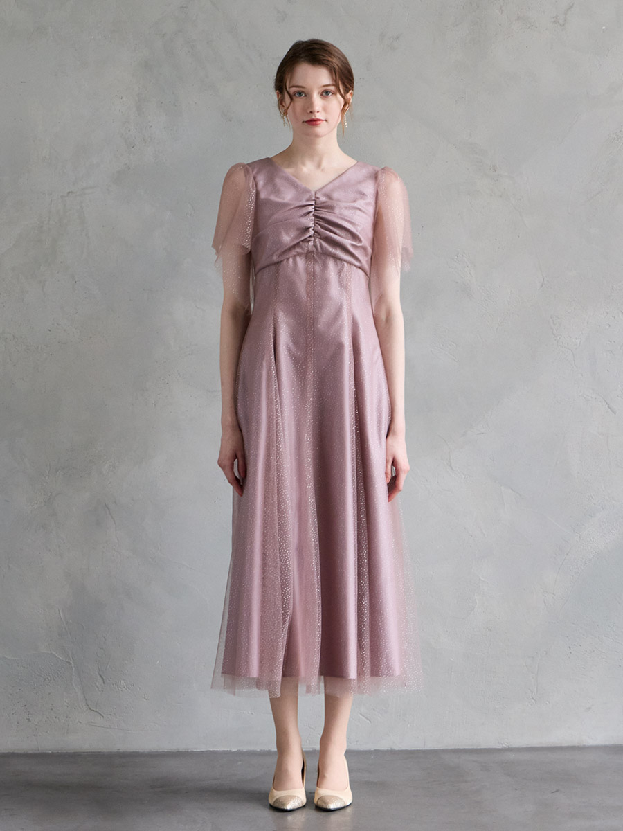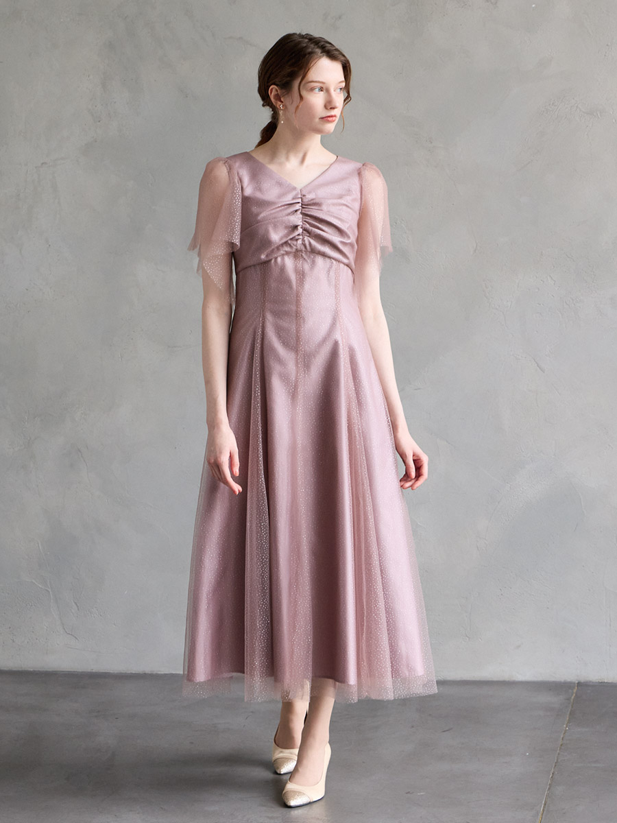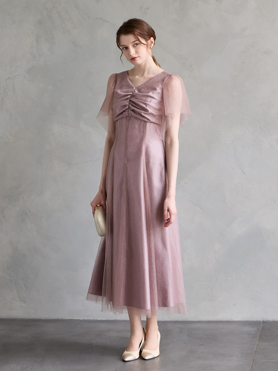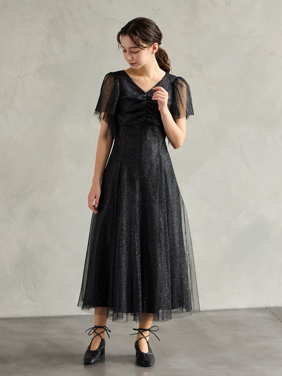 きらめきと軽やかさで魅せる、フェミニンな細見えドレス。