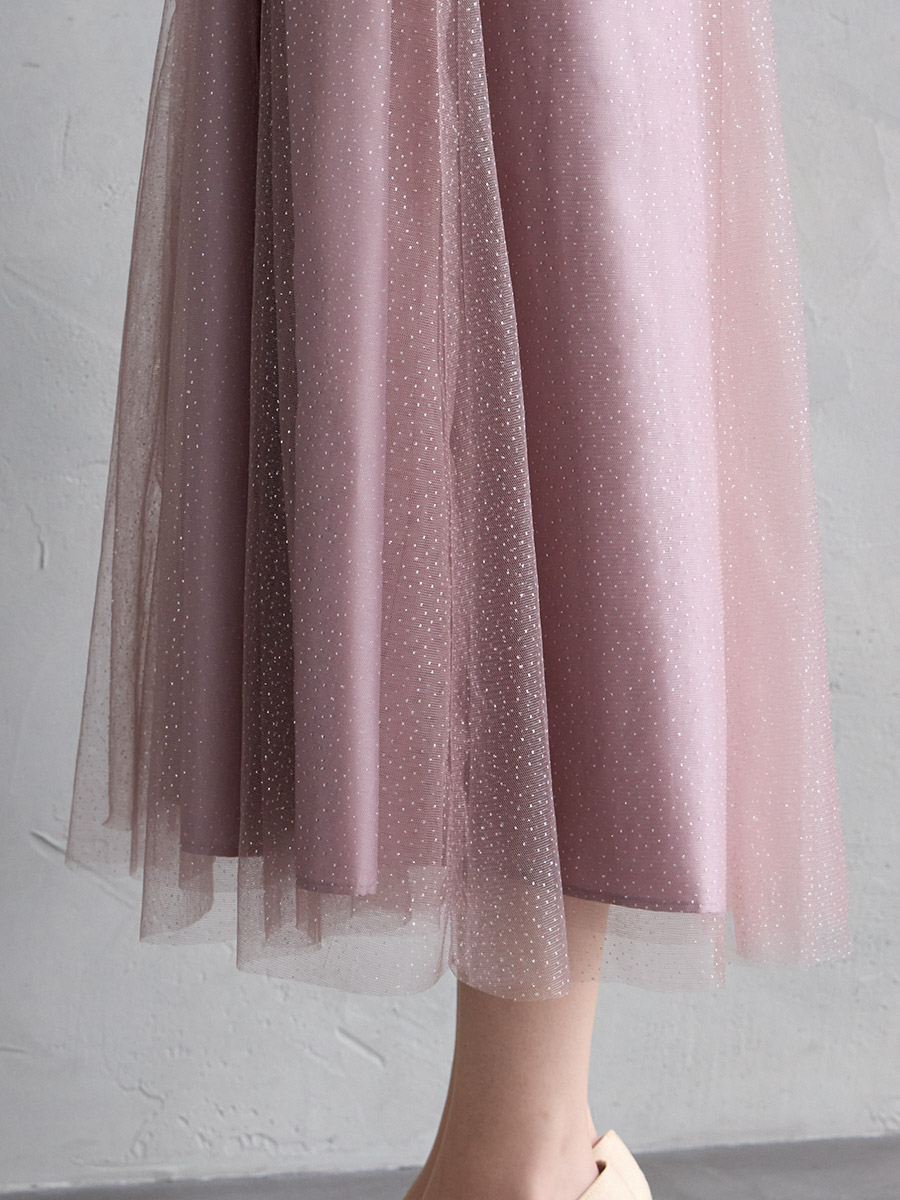 ・動くたびにきらめく輝くグリッターチュール素材と無地チュールを重ねることでエアリーな印象に