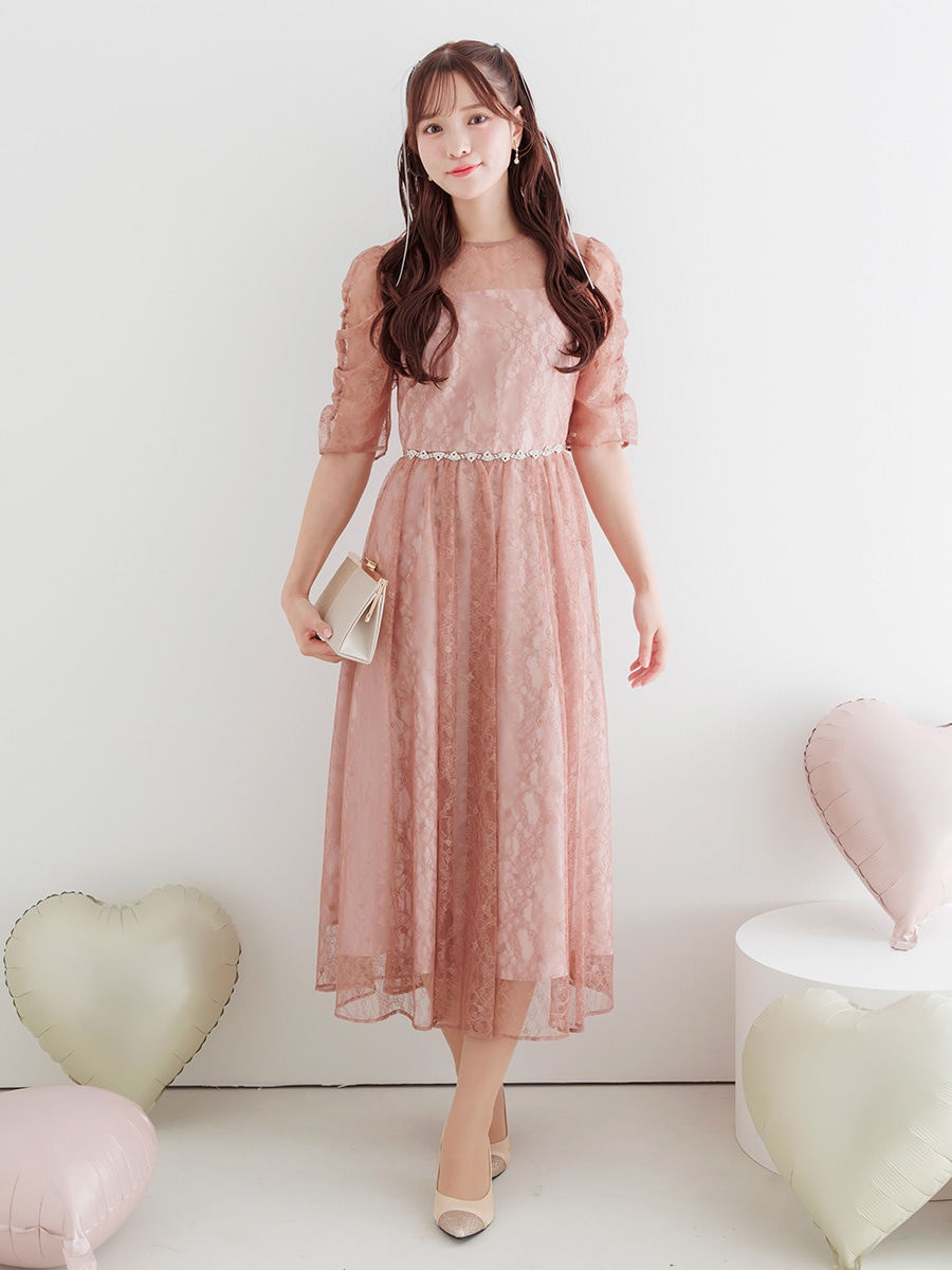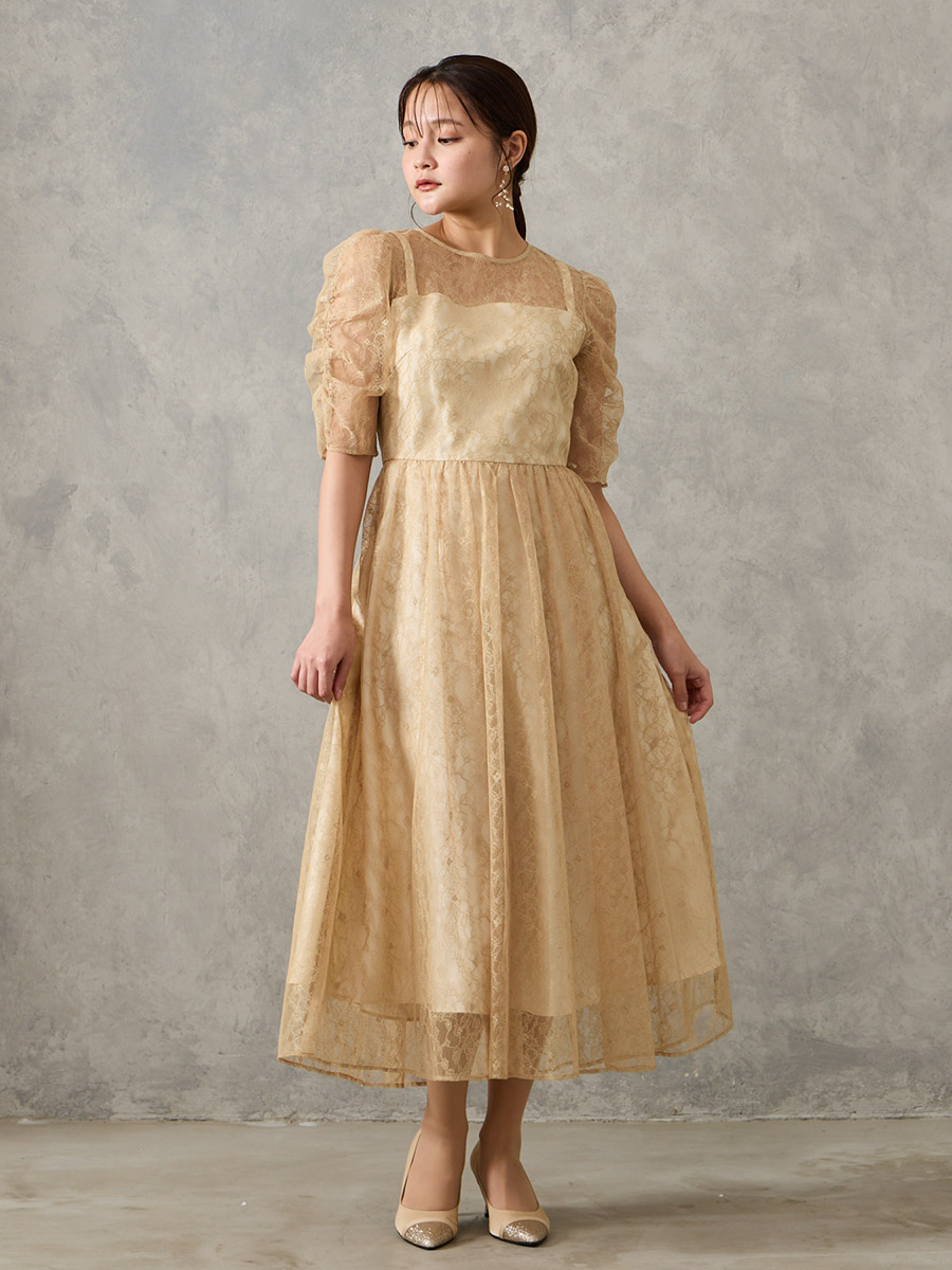 ラメレースギャザースリーブレースアップフィット&フレアドレス