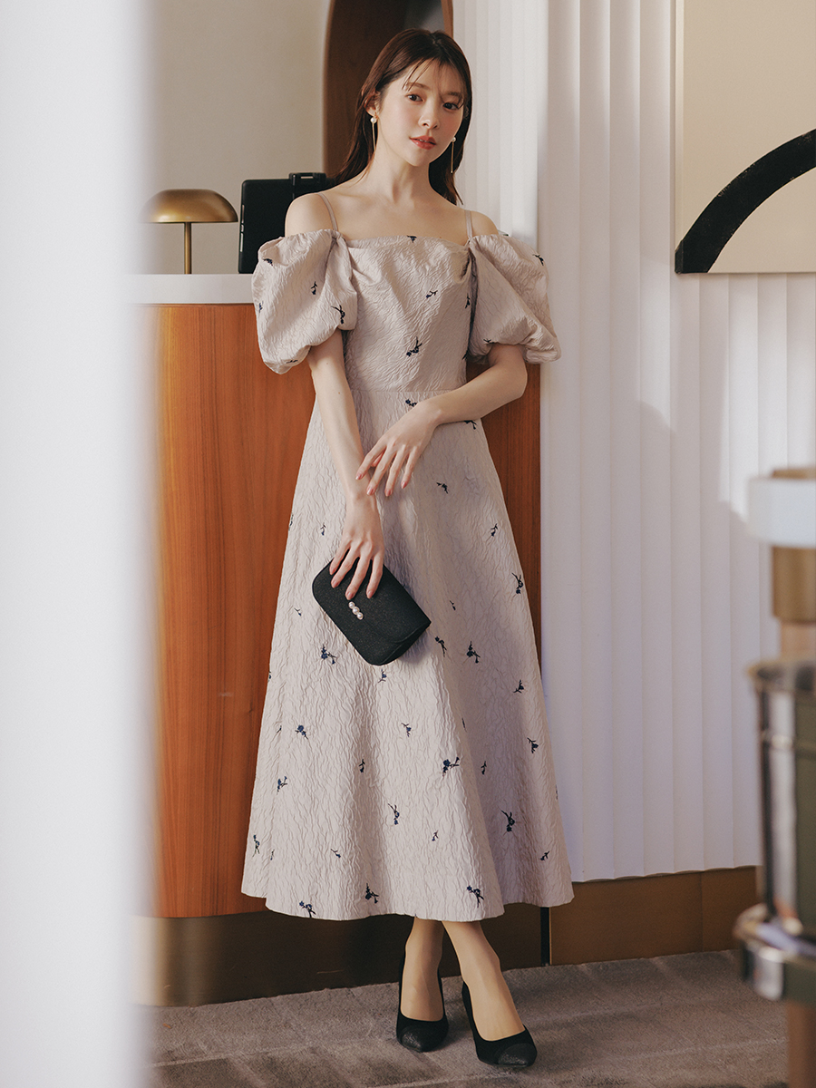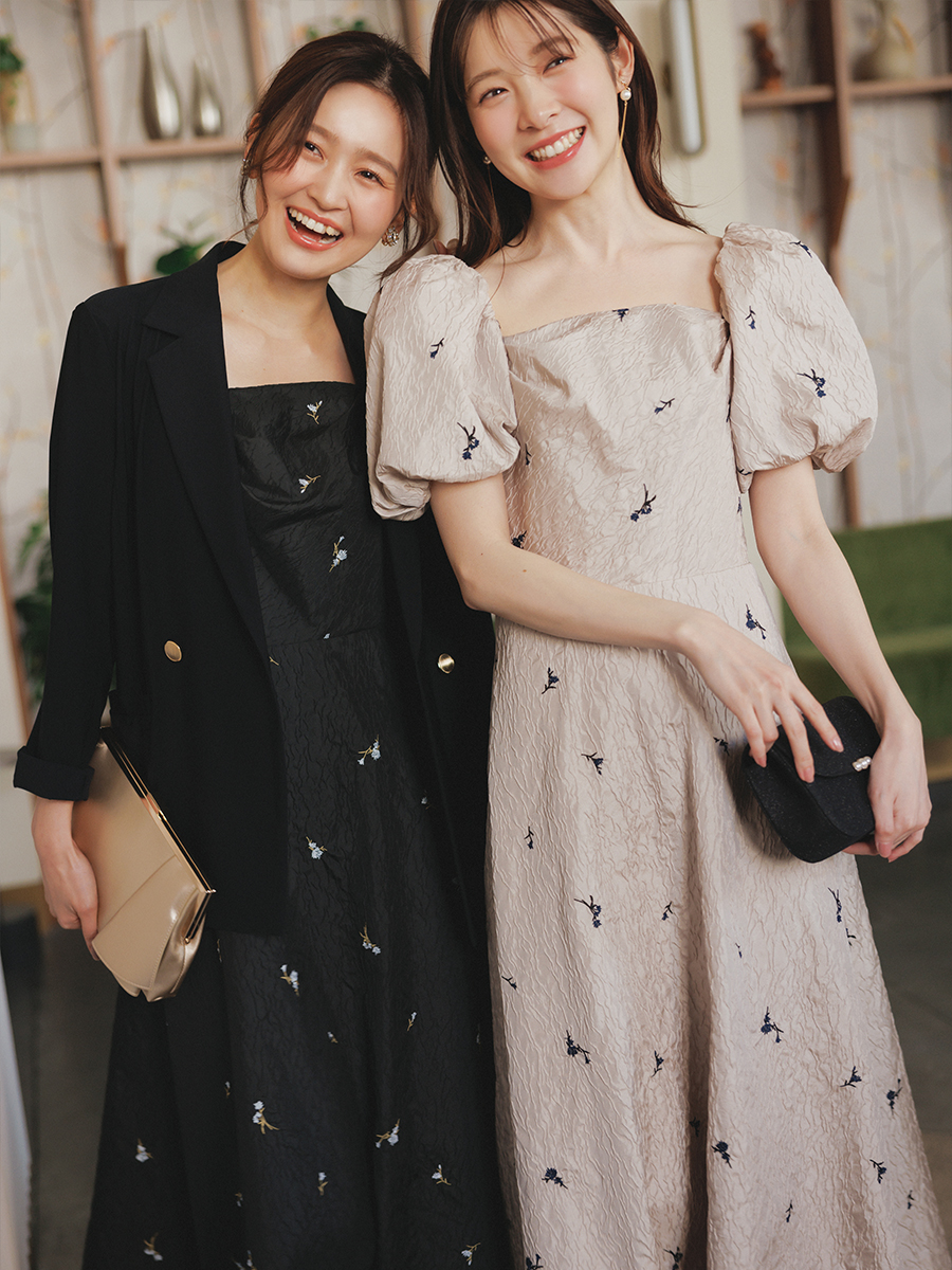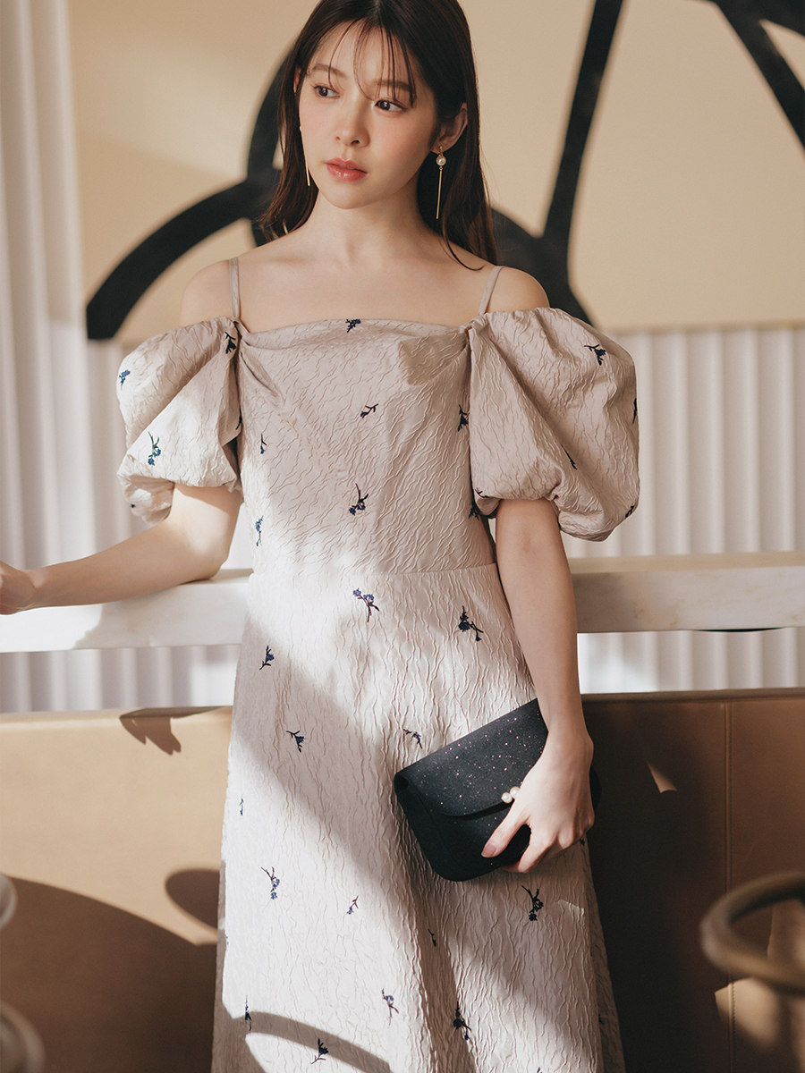 3WAYスリーブフラワー刺繍ジャカードフィット&フレアドレス