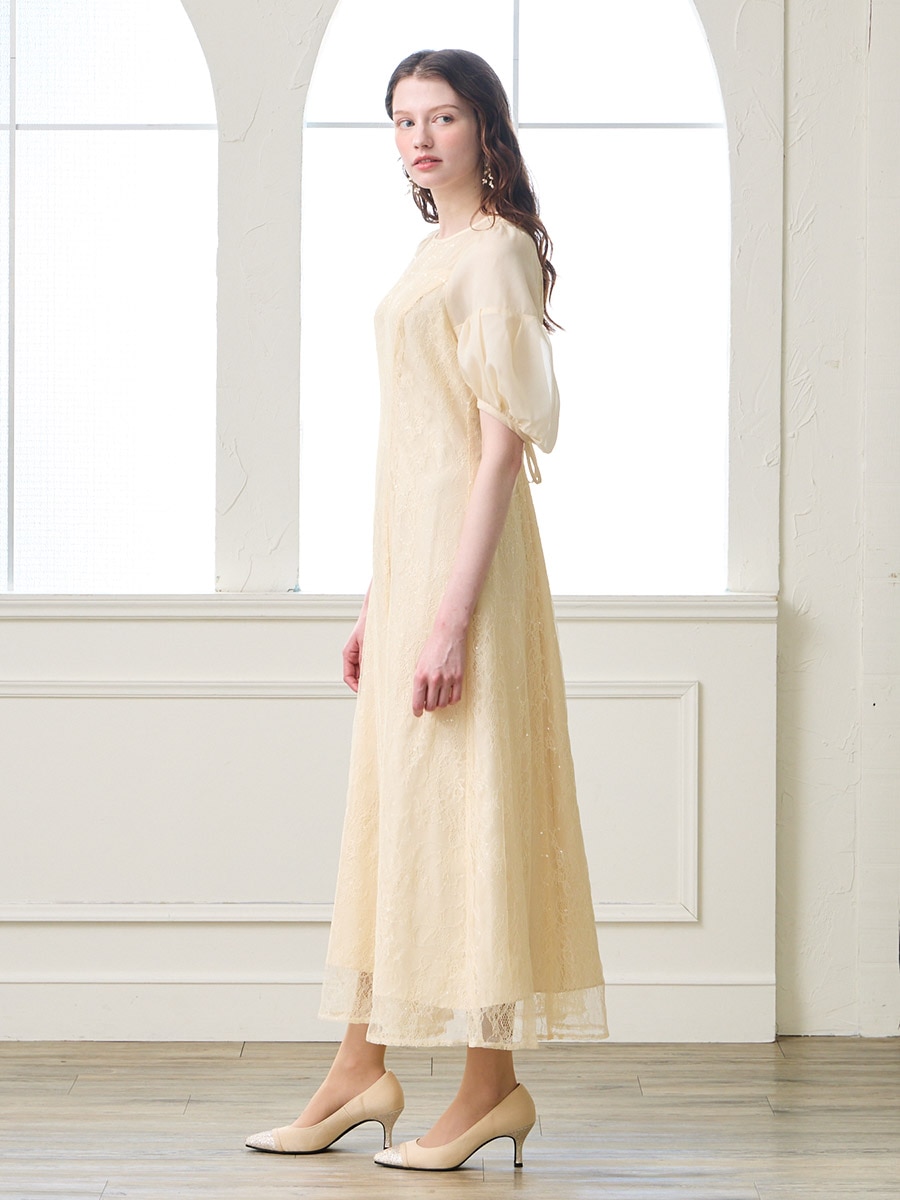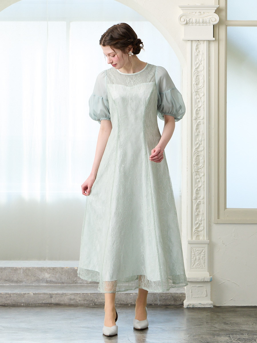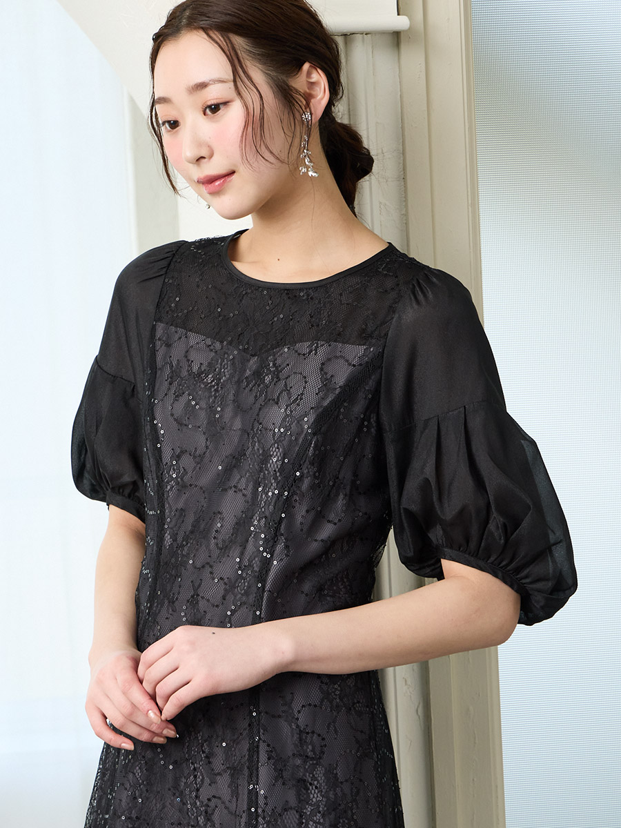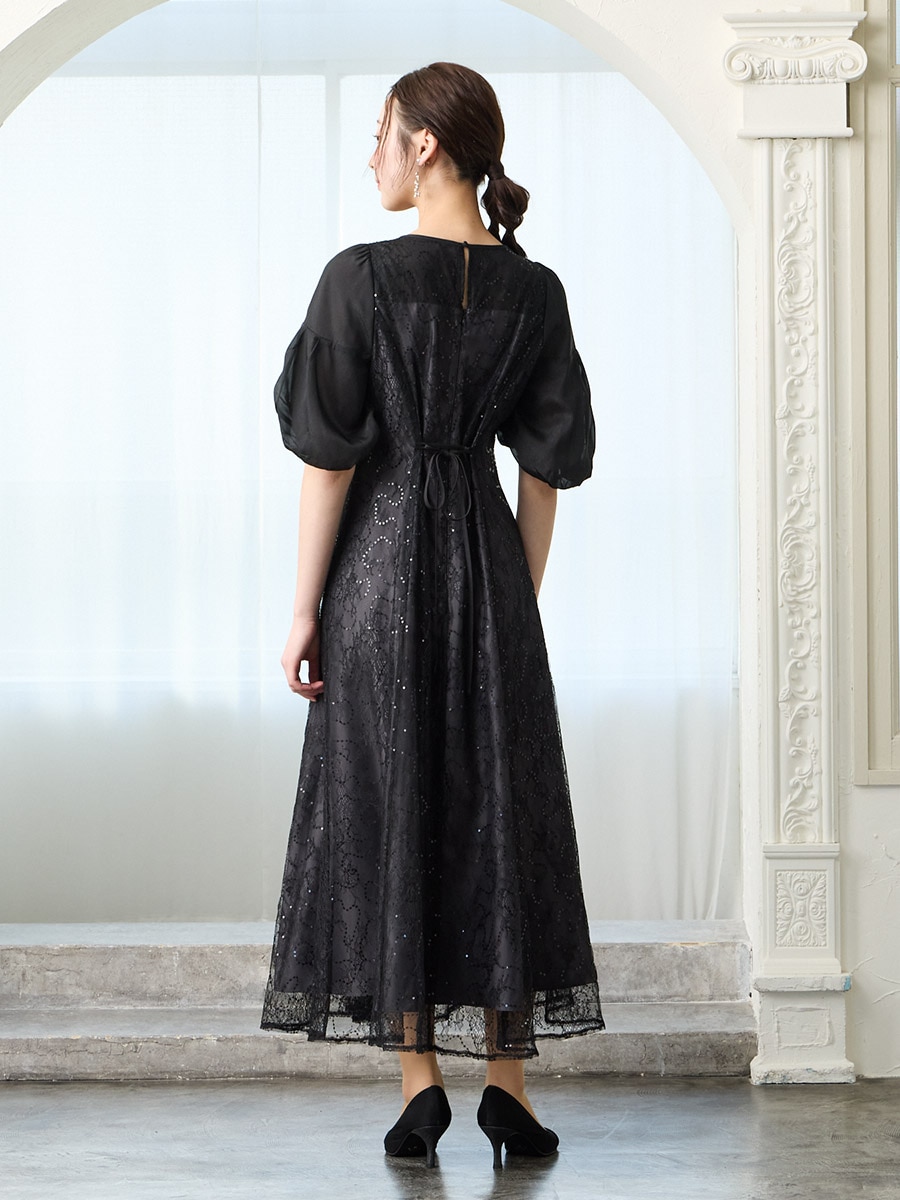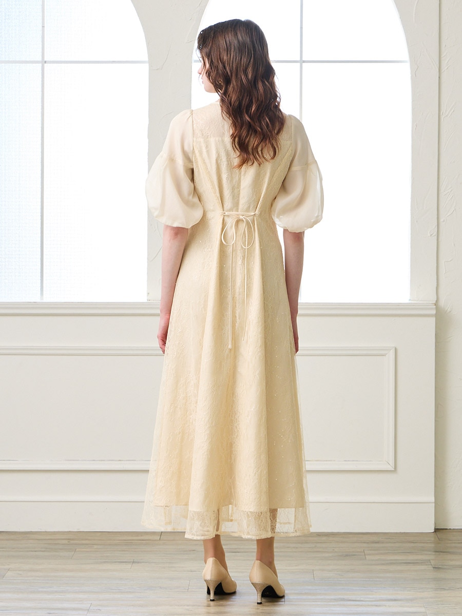 【試着キャンペーン対象】オーガンジーボリュームスリーブスパンコールレースAラインドレス