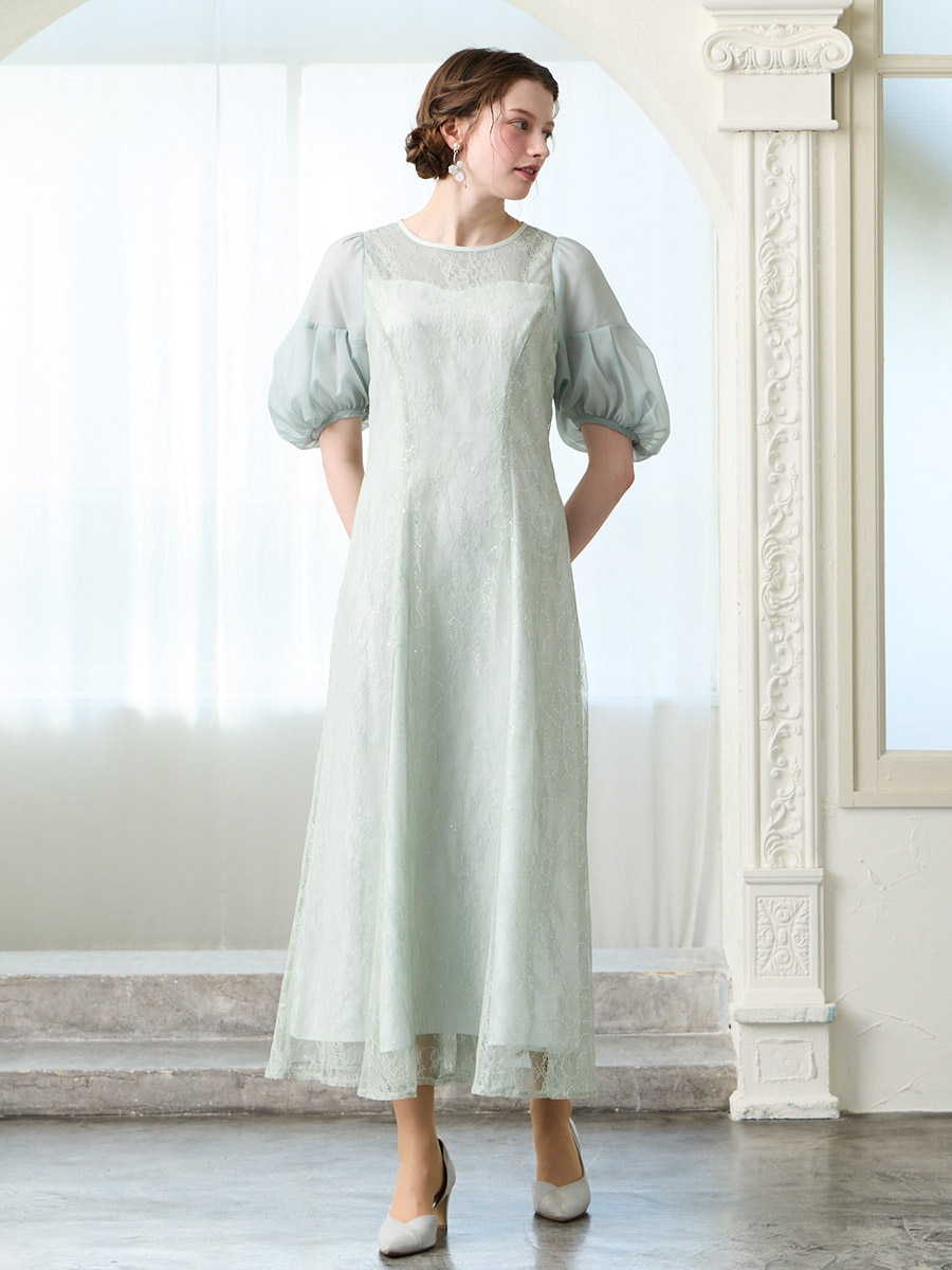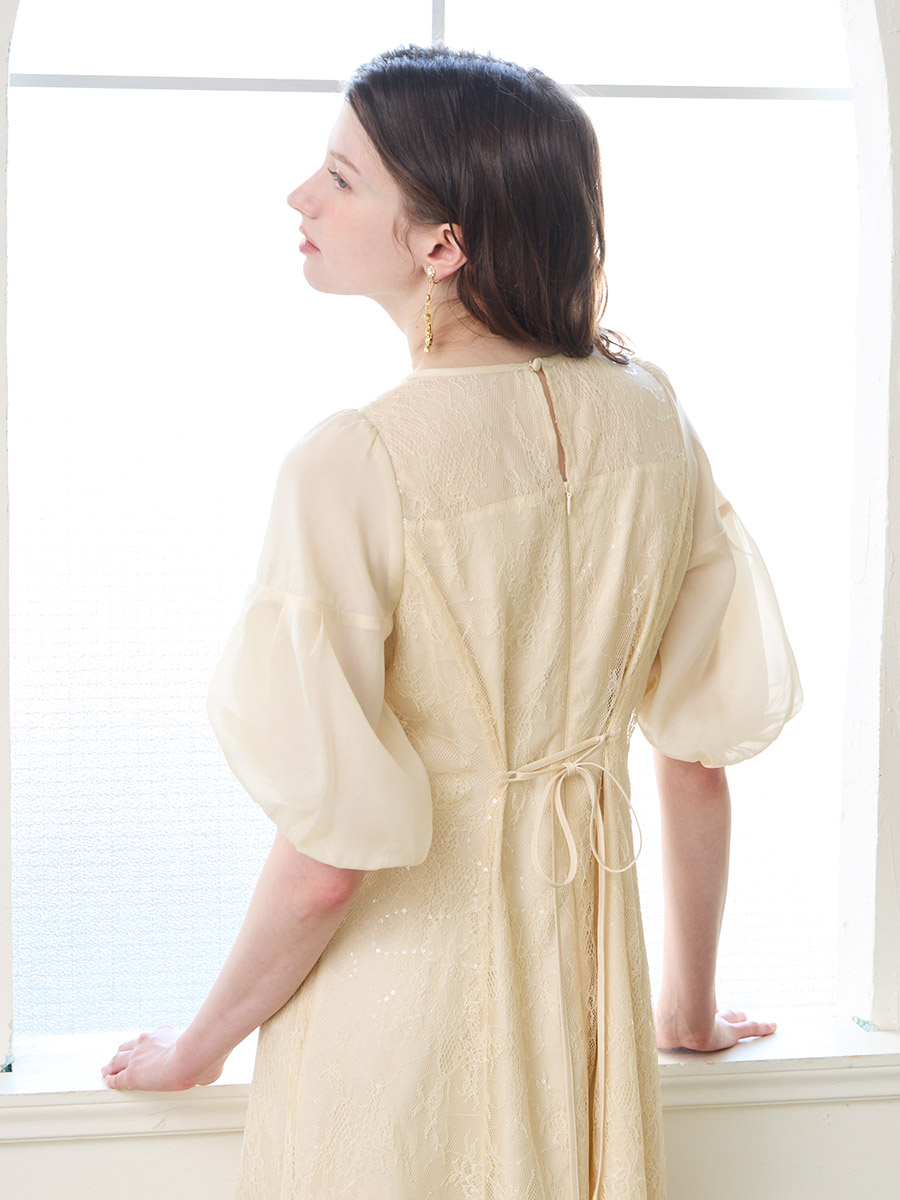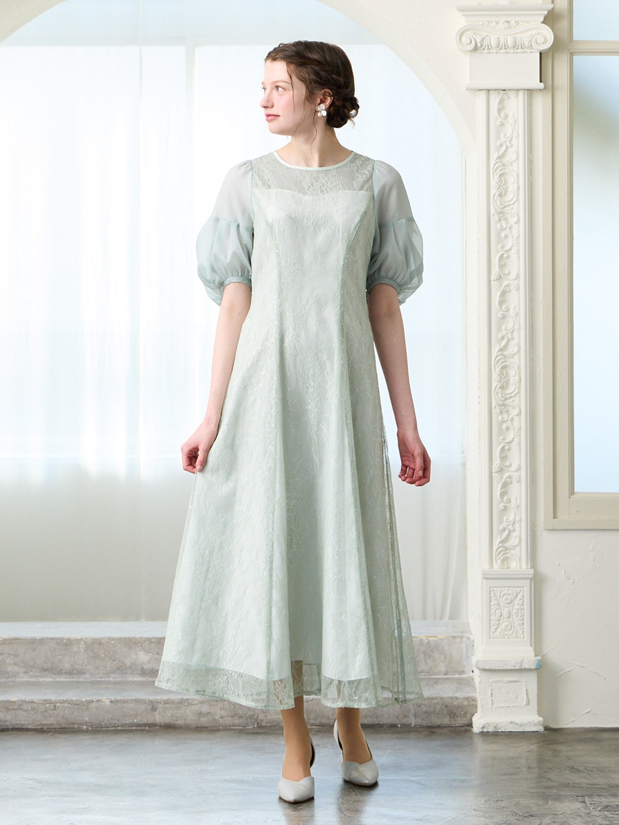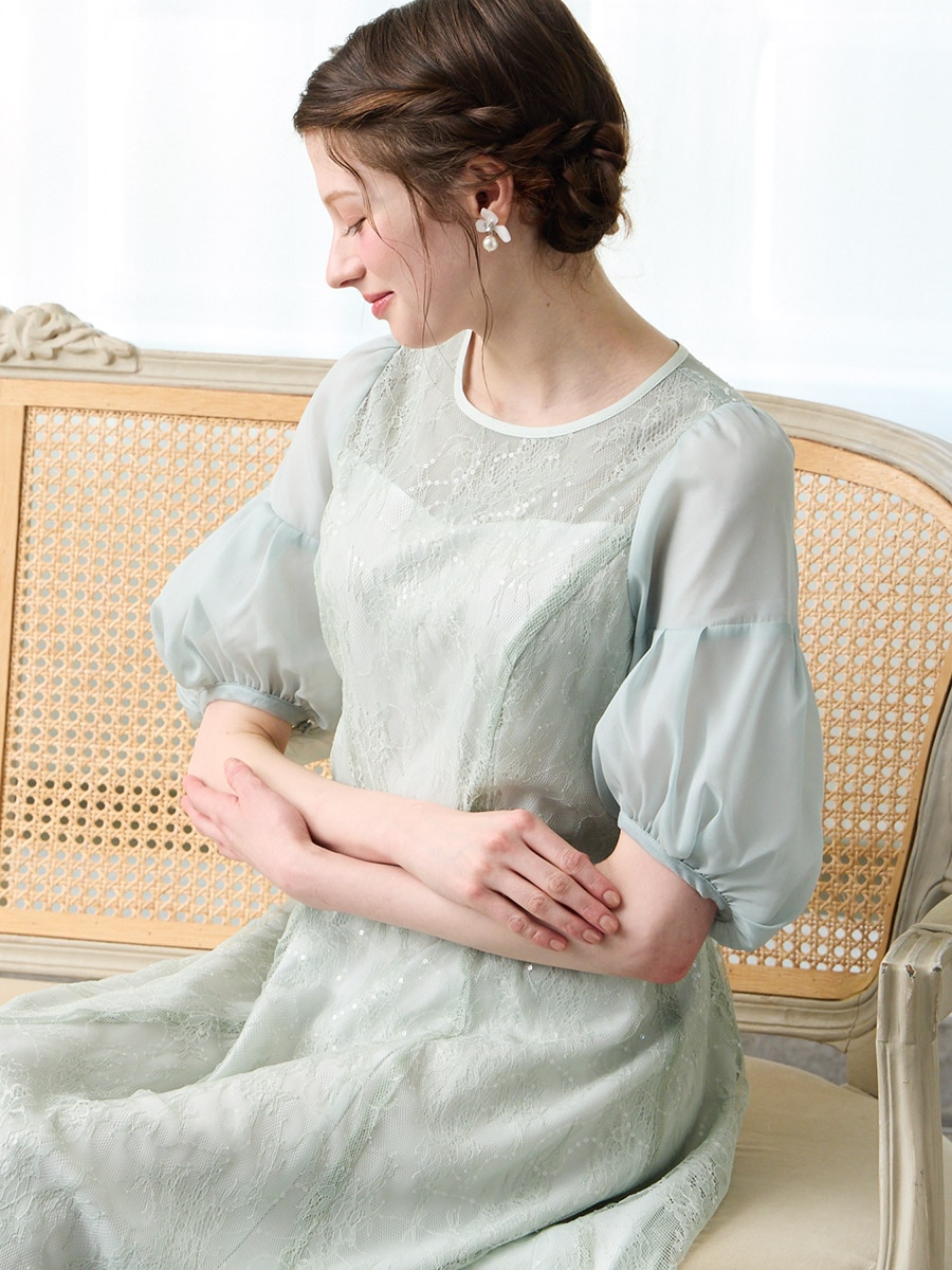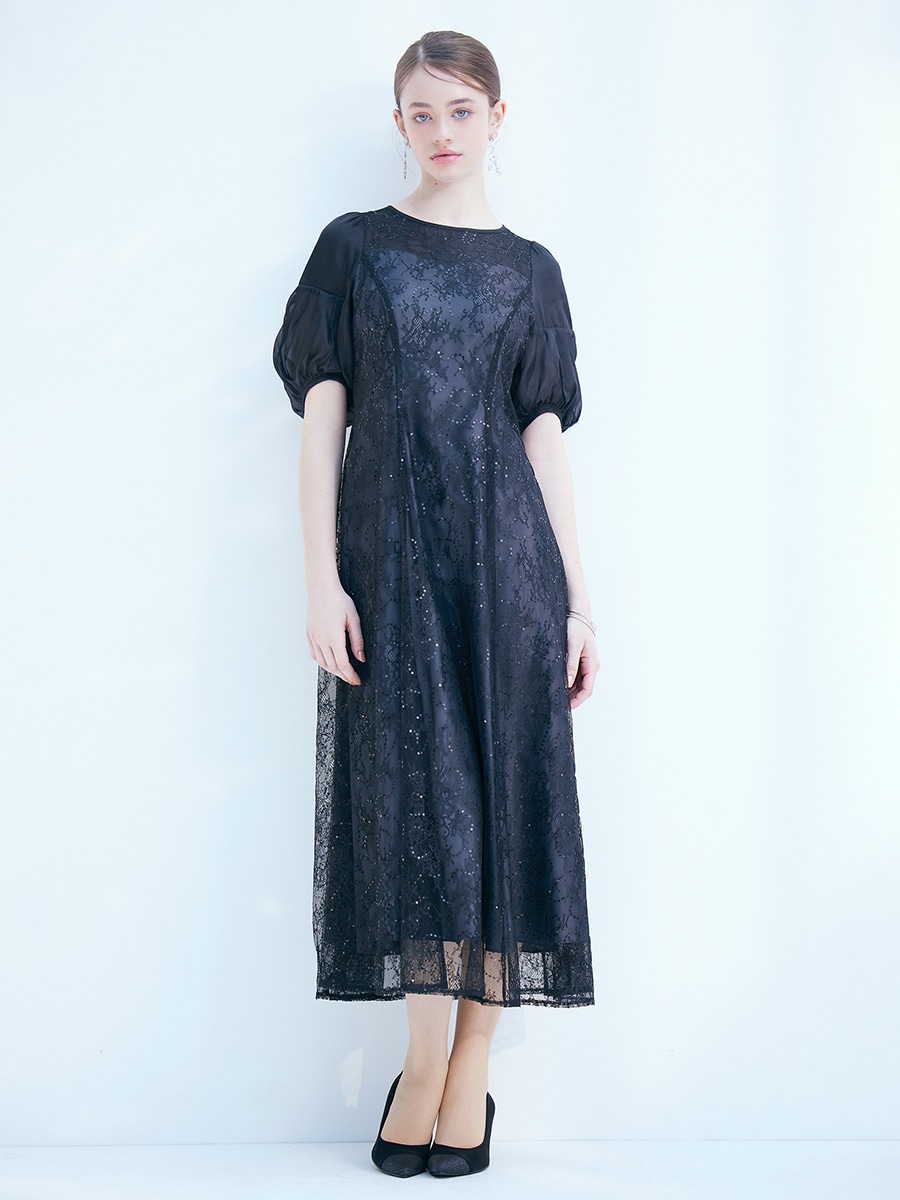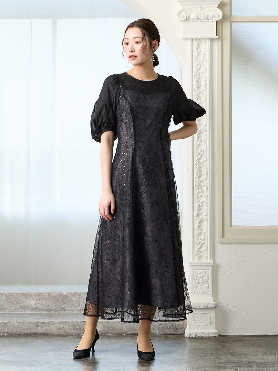 【試着キャンペーン対象】オーガンジーボリュームスリーブスパンコールレースAラインドレス