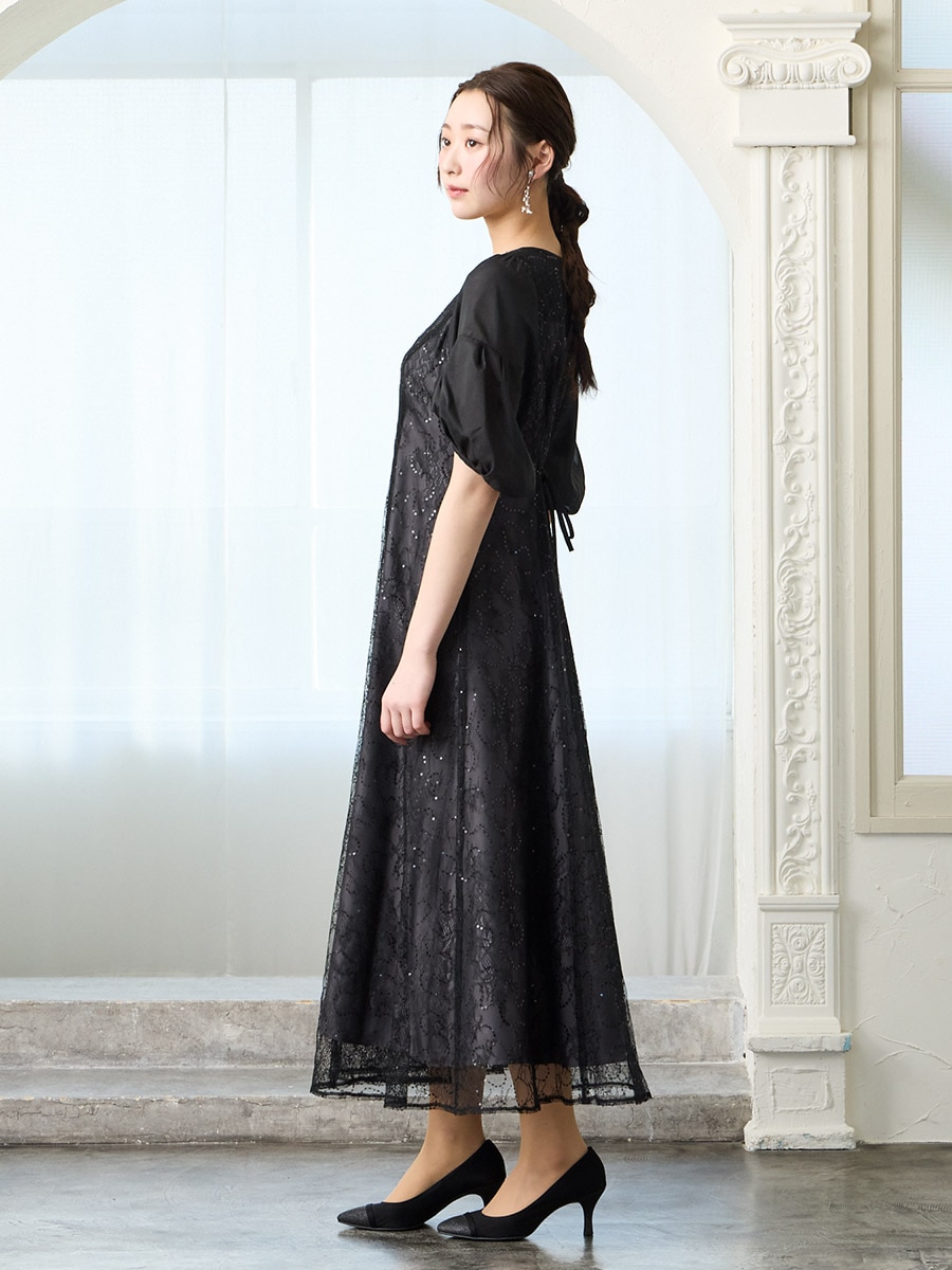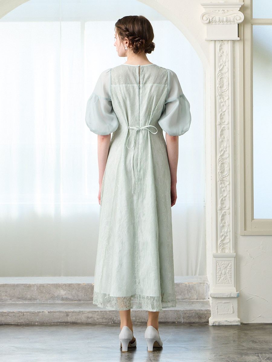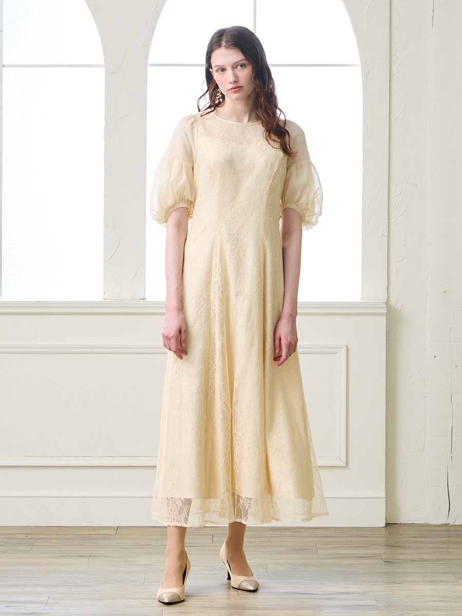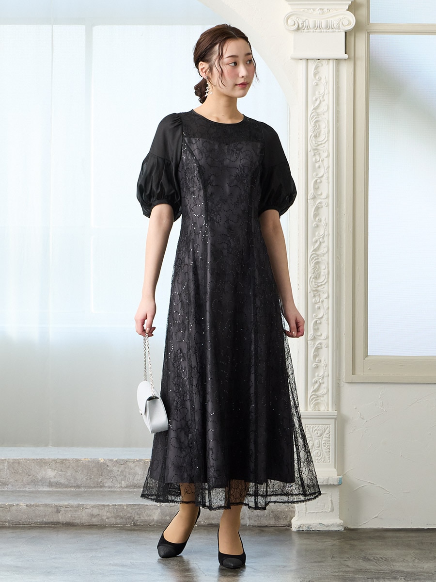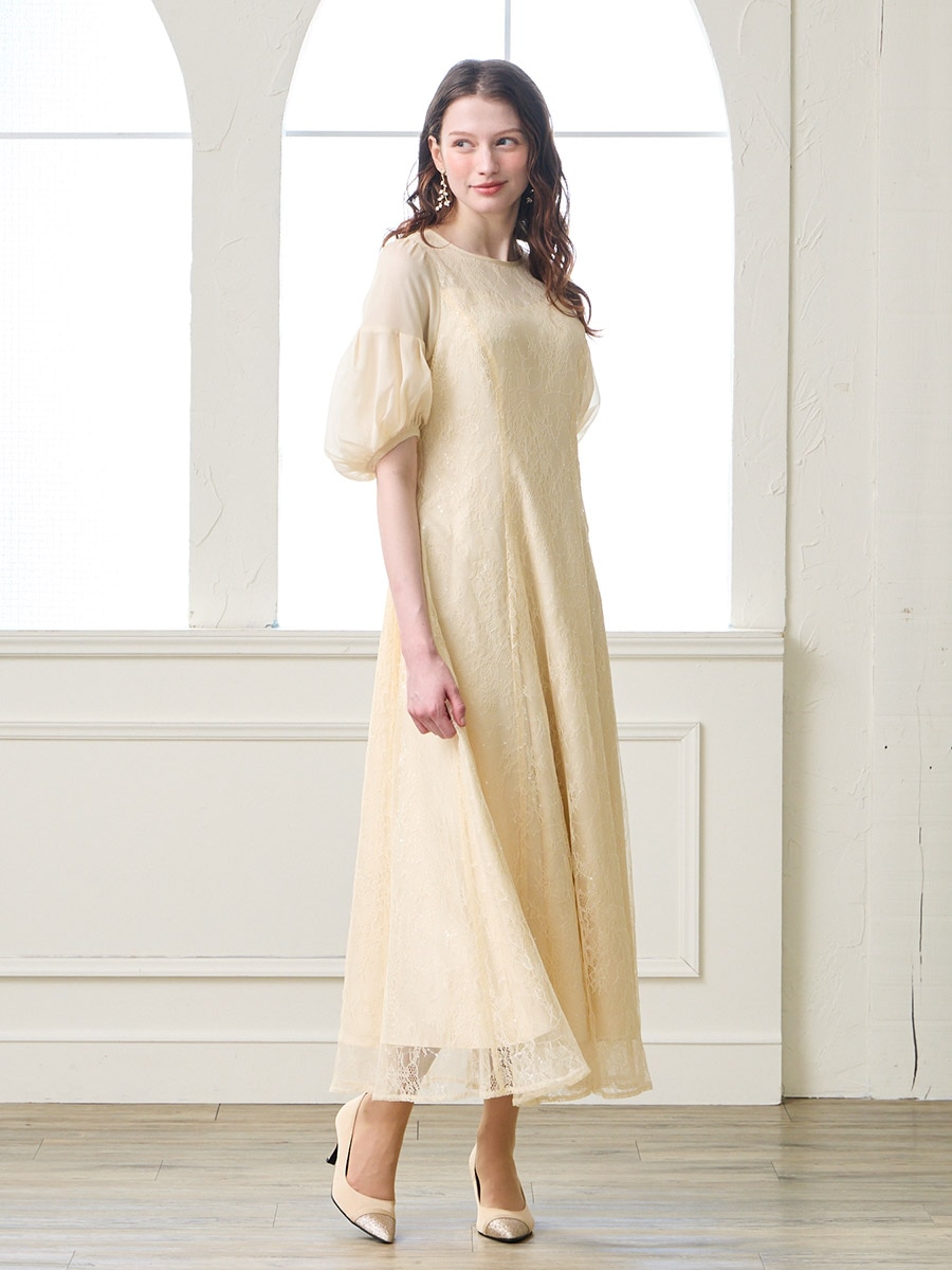 【試着キャンペーン対象】オーガンジーボリュームスリーブスパンコールレースAラインドレス