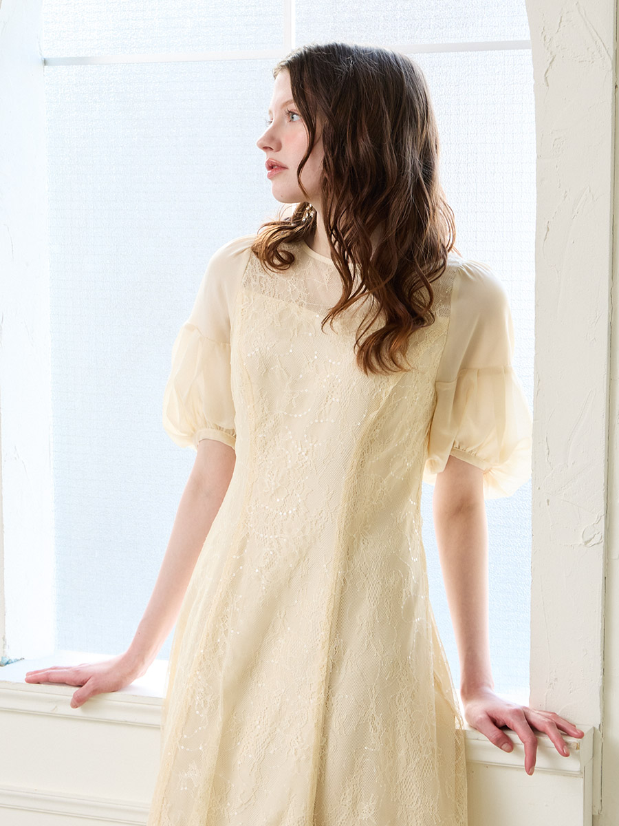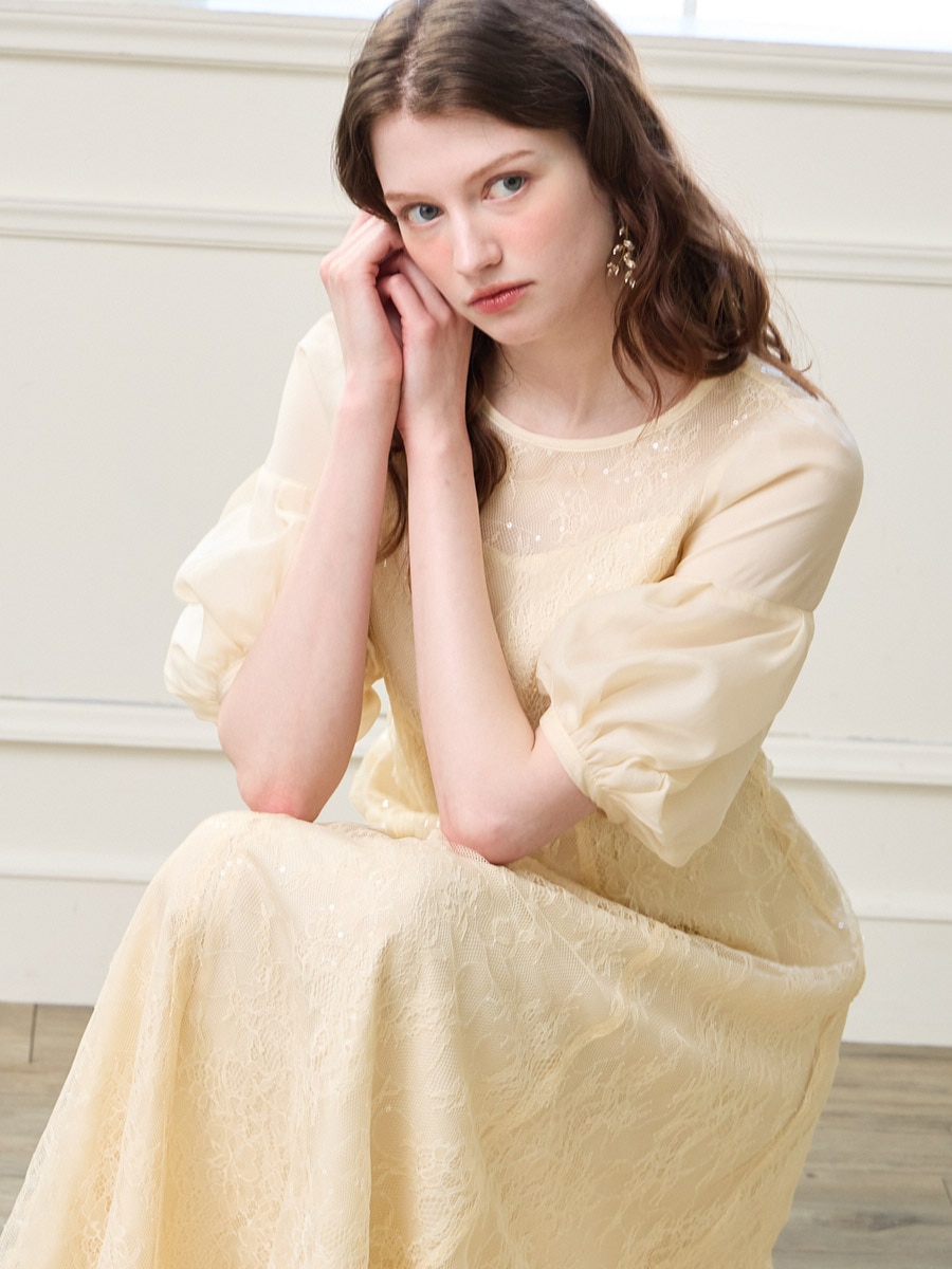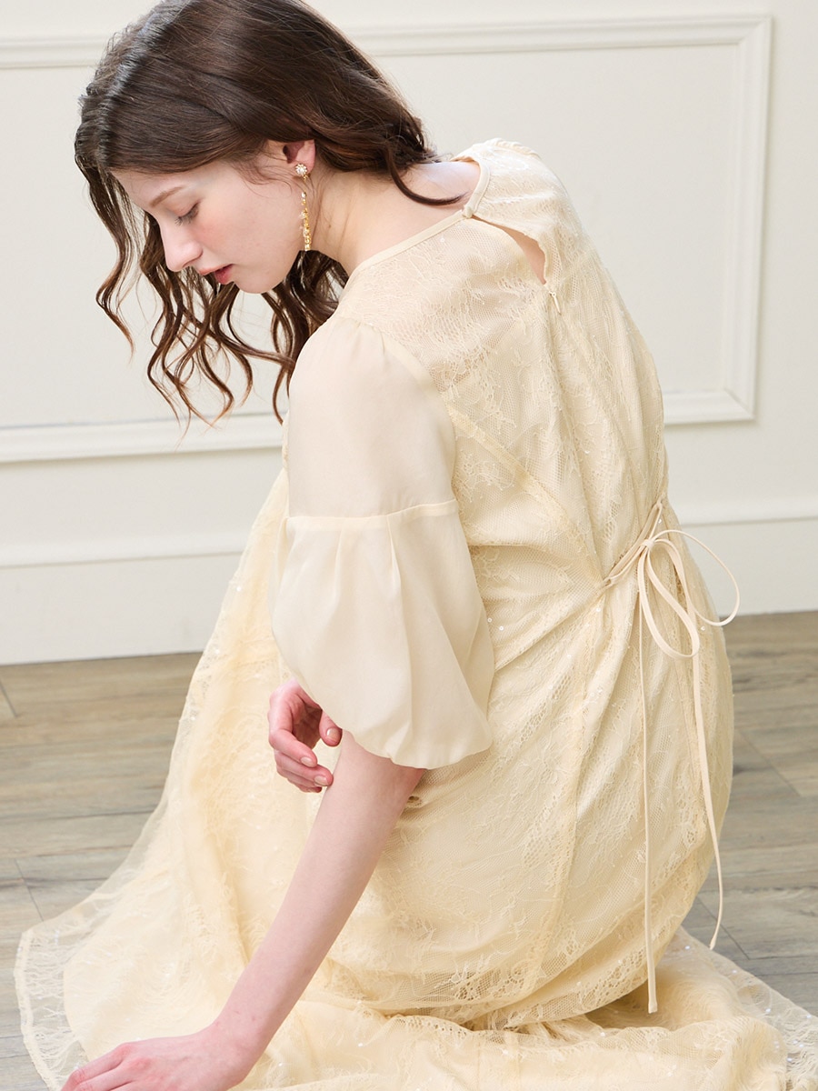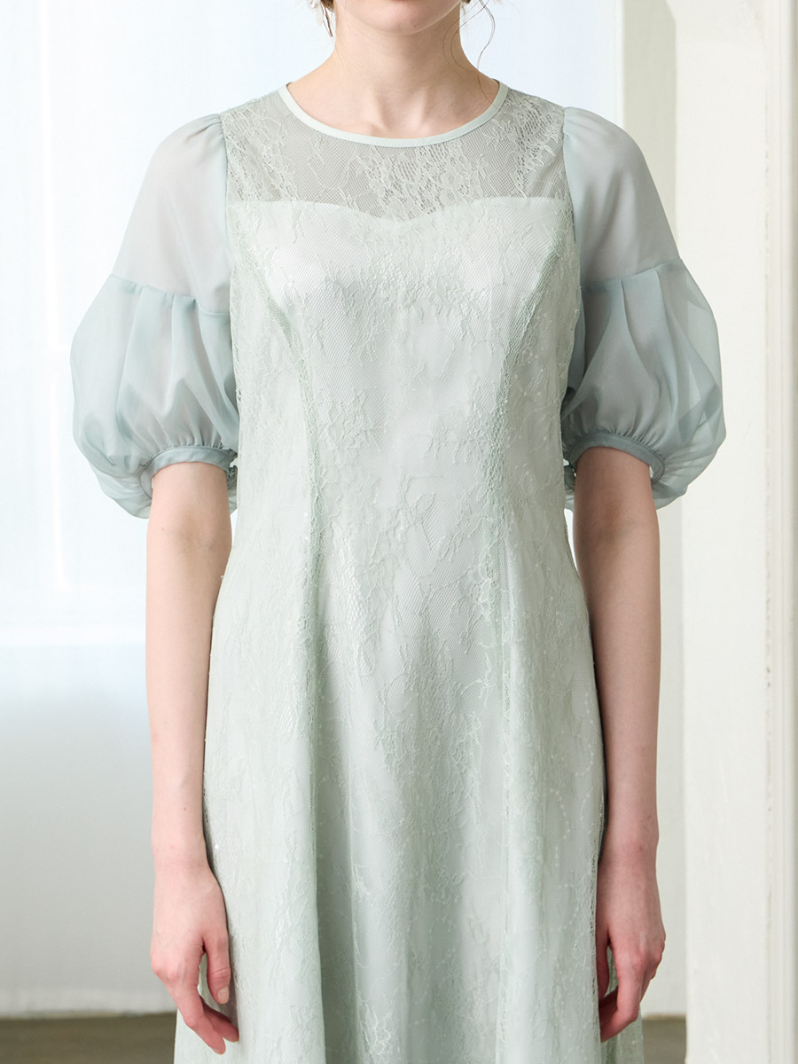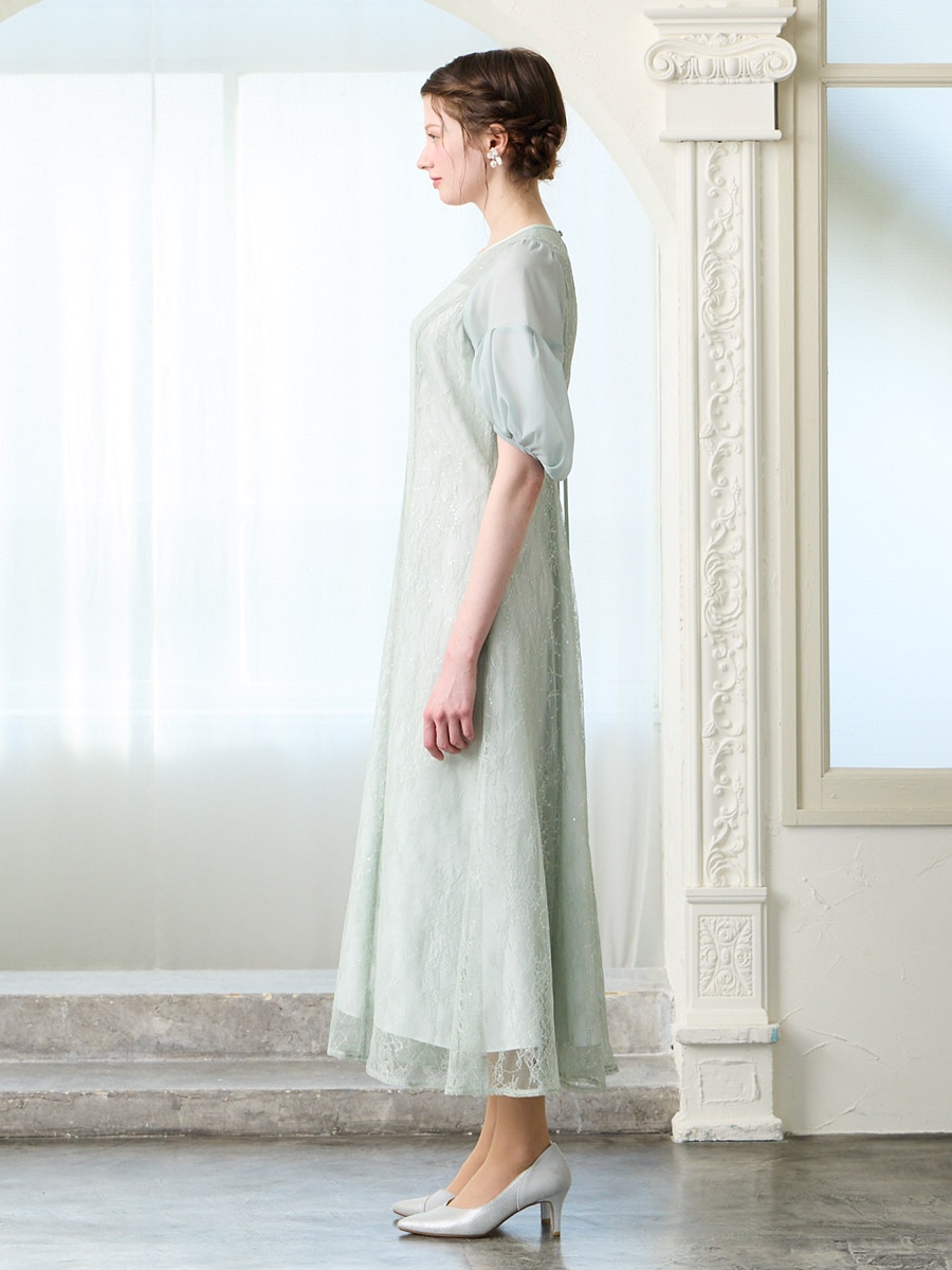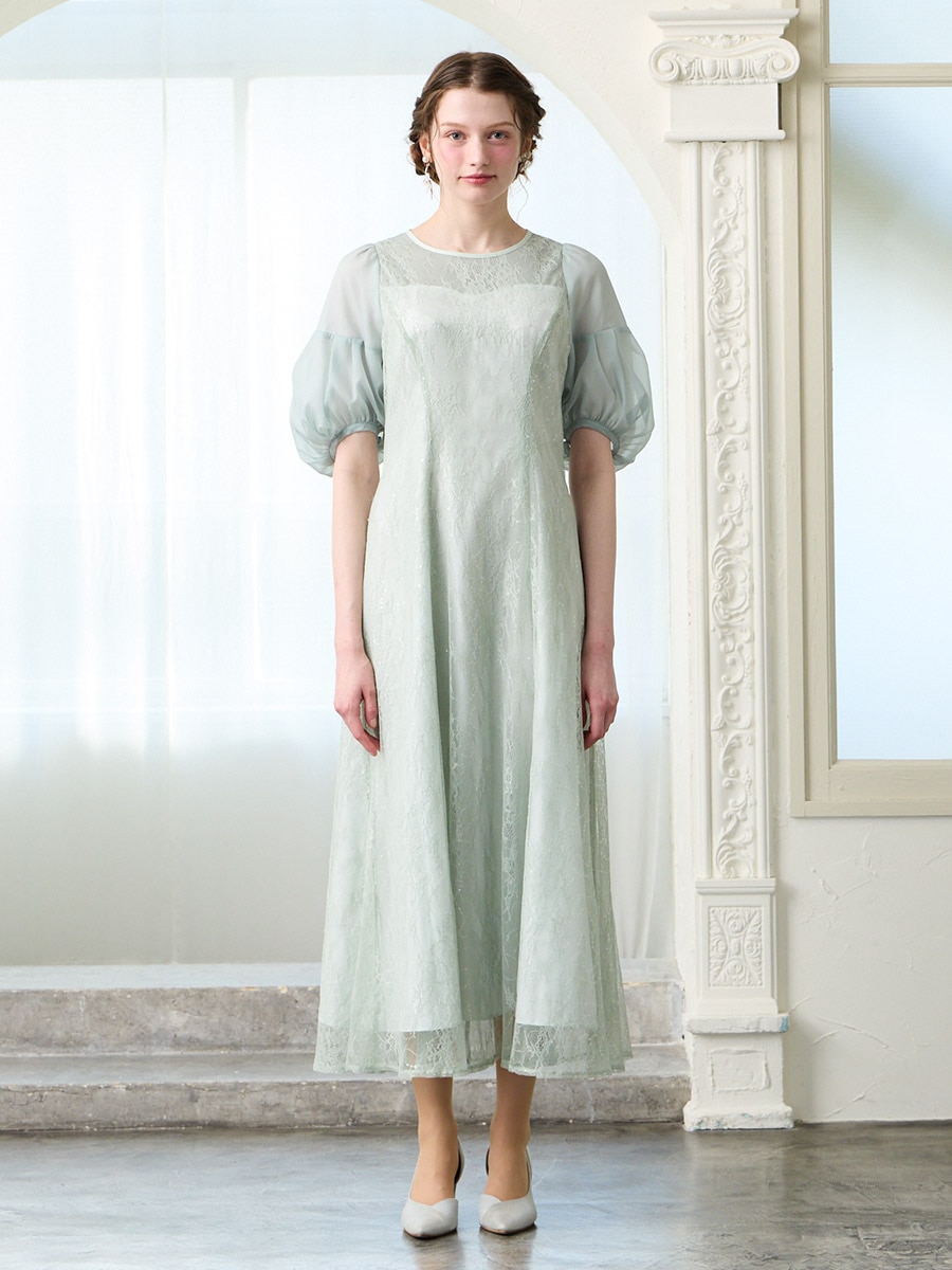【試着キャンペーン対象】オーガンジーボリュームスリーブスパンコールレースAラインドレス