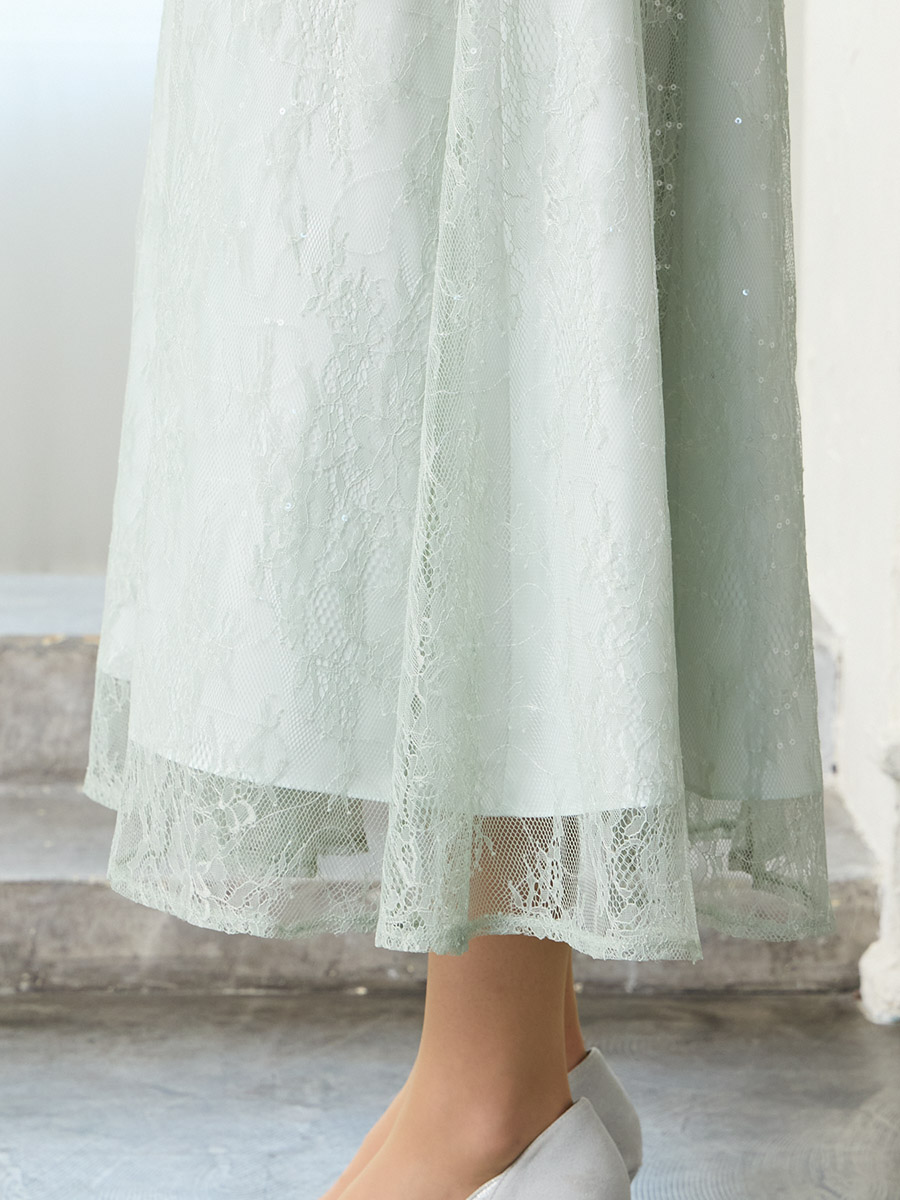 ・繊細なフラワーモチーフのラッセルレースにクリアスパンコール刺繍を施した素材を使用し、動くたびに光を反射してきらめきます