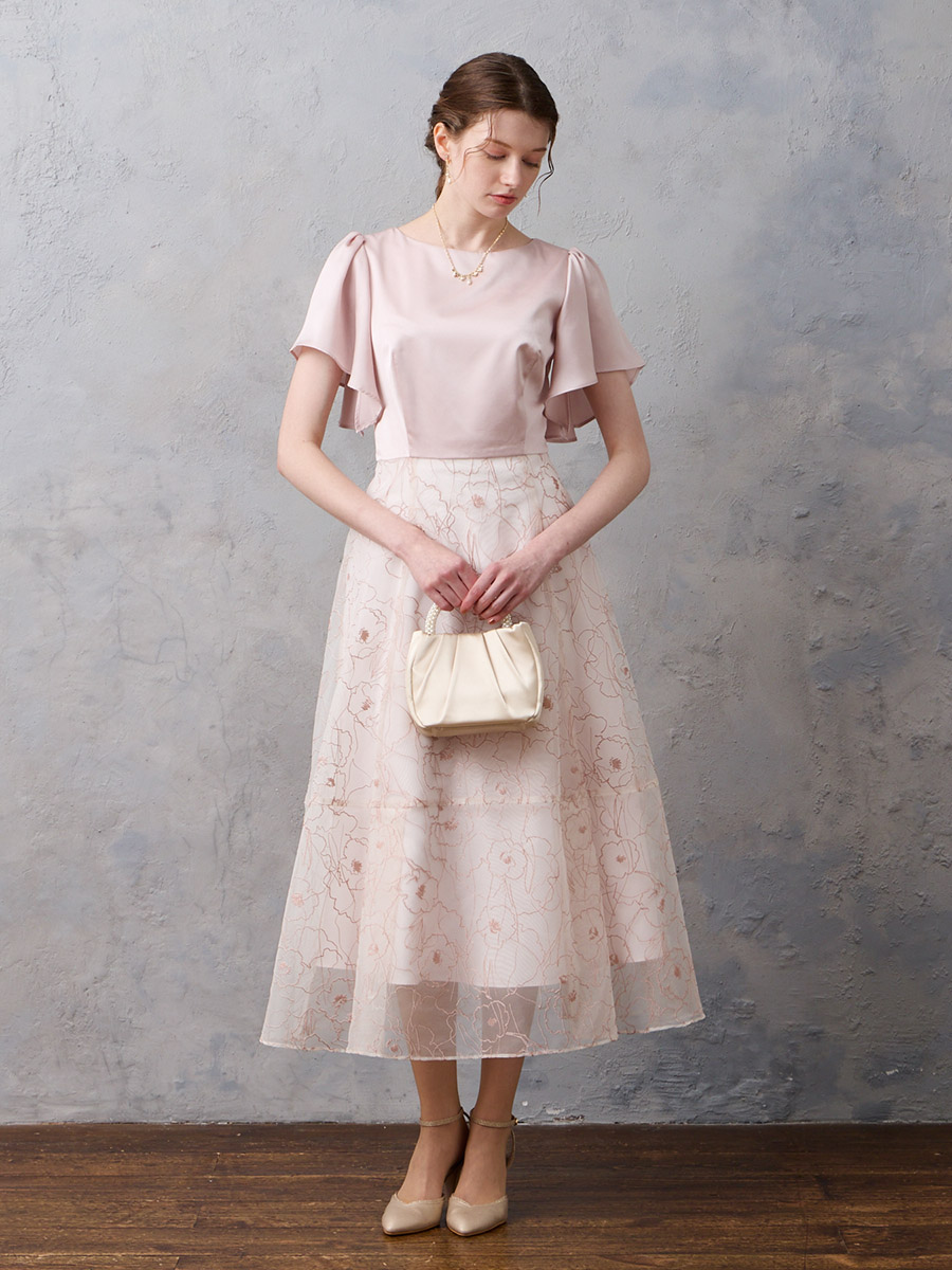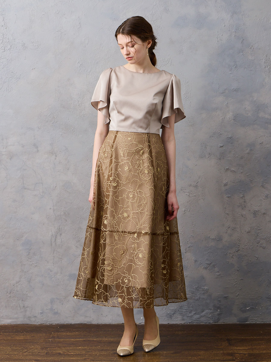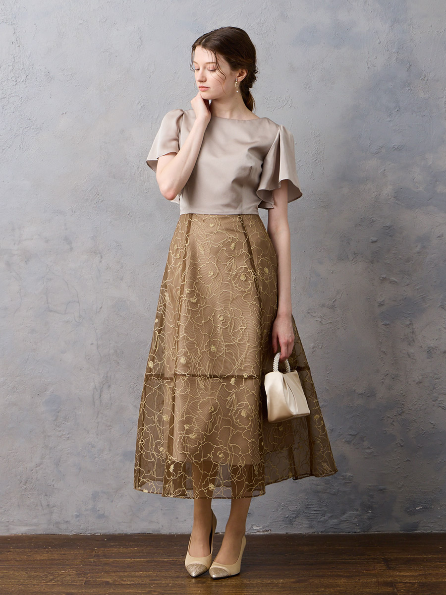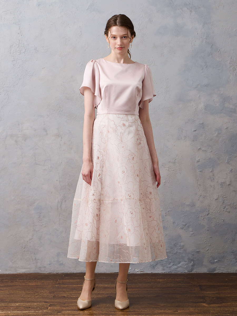 スカートには切り替えを入れることで、メリハリのあるフレアシルエットに。