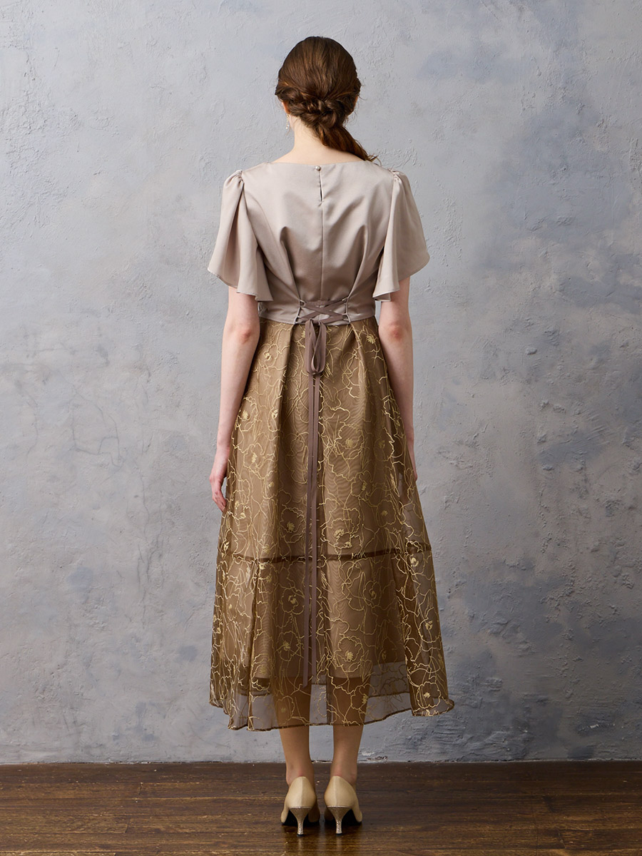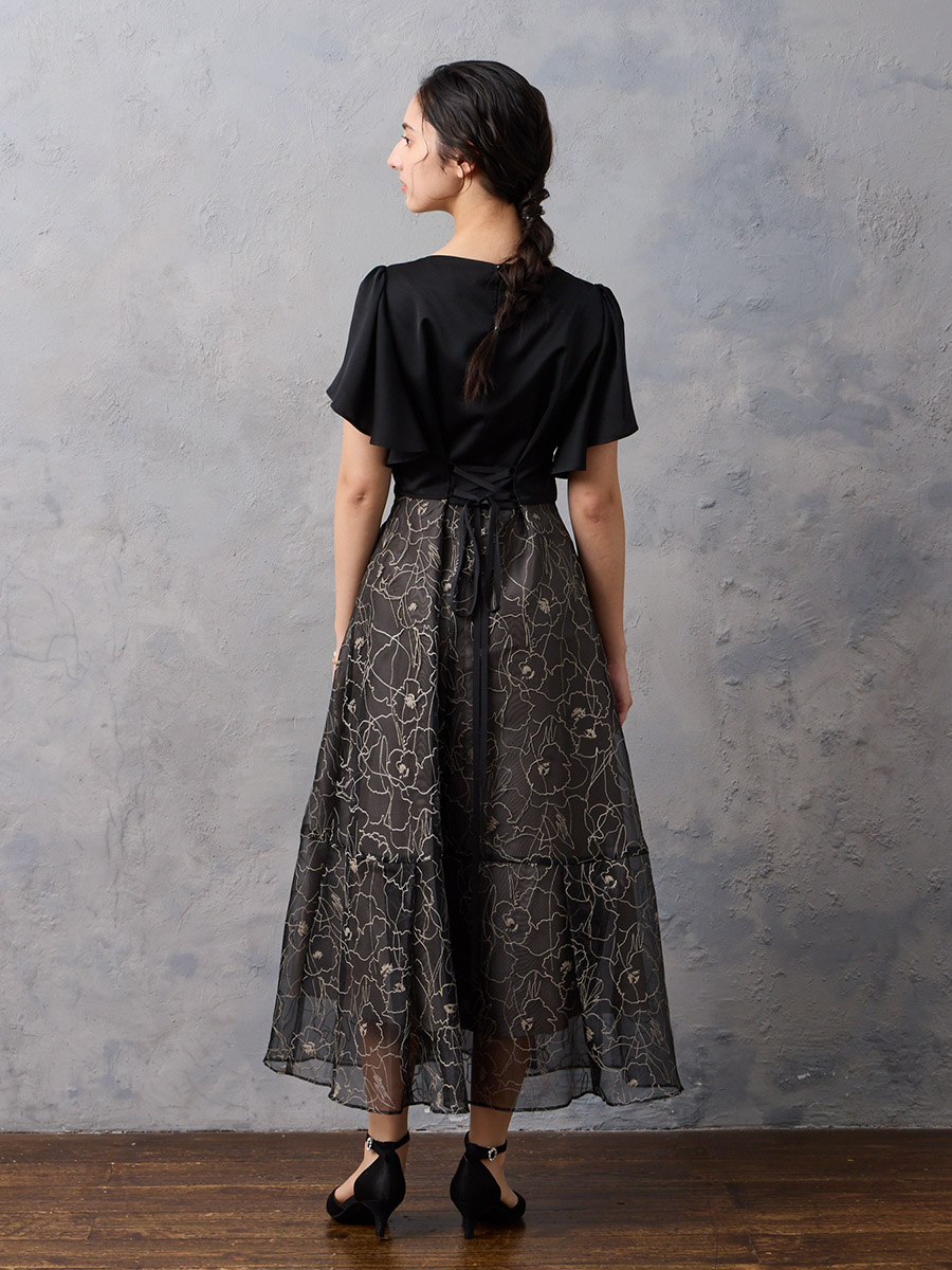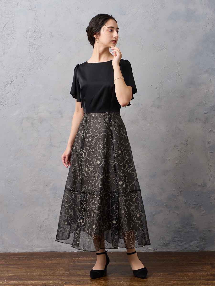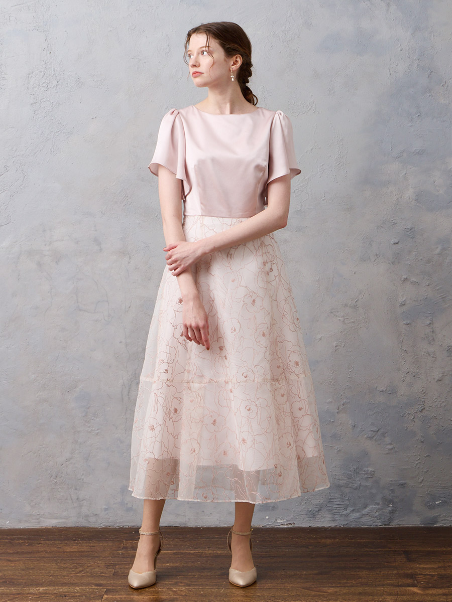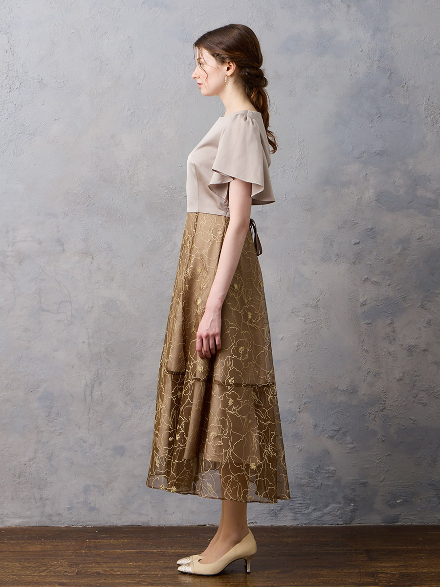 スカートには切り替えを入れることで、メリハリのあるフレアシルエットに。