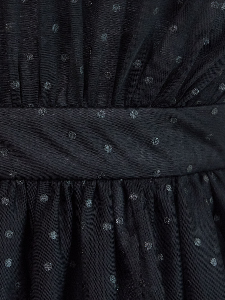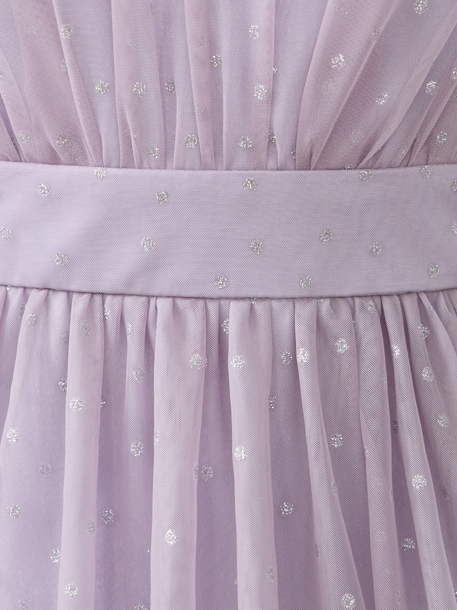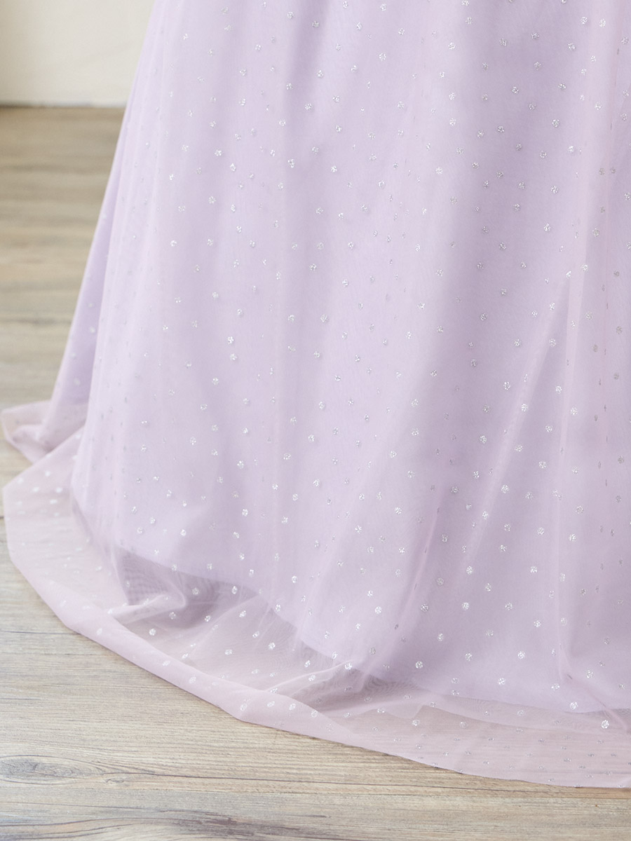 透け感のあるチュール素材にドットのグリッターが映えるロングドレス。