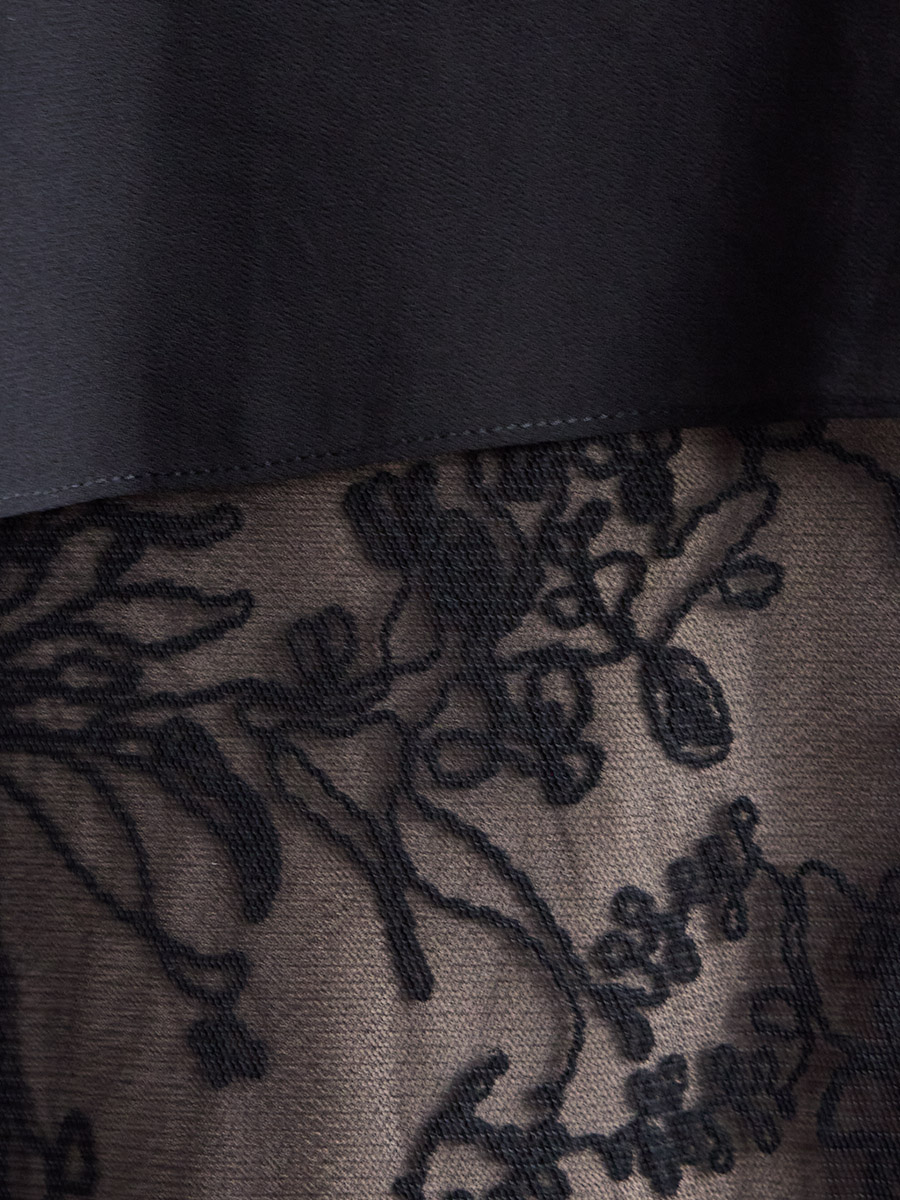 胸元のヨーク部分は裏地に肌色のシフォンを重ね、露出をカバーしながら抜け感のあるデザインです。