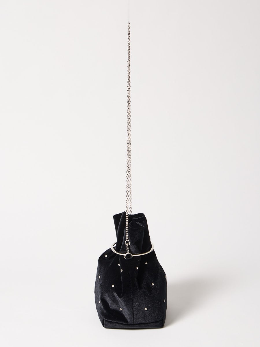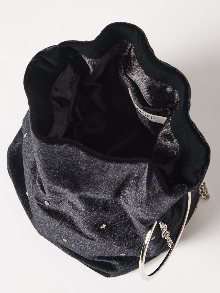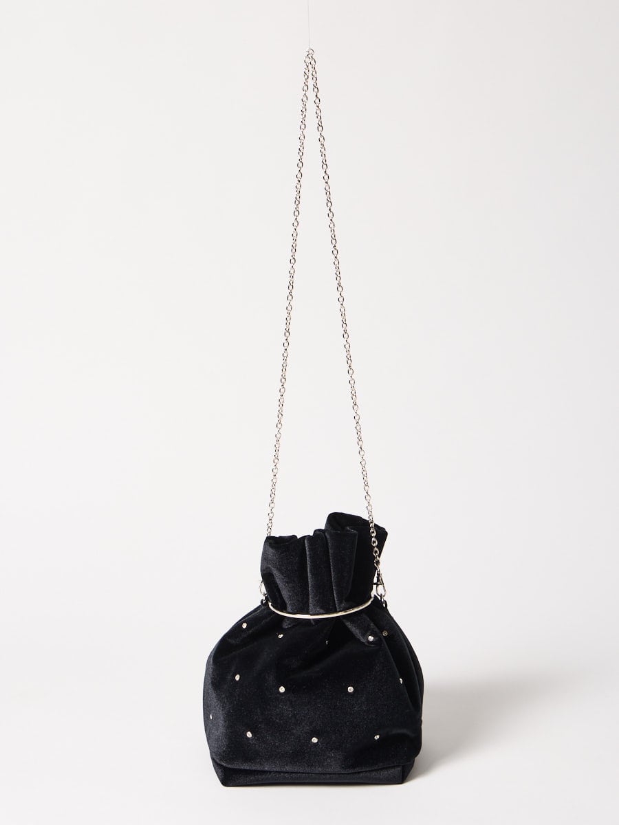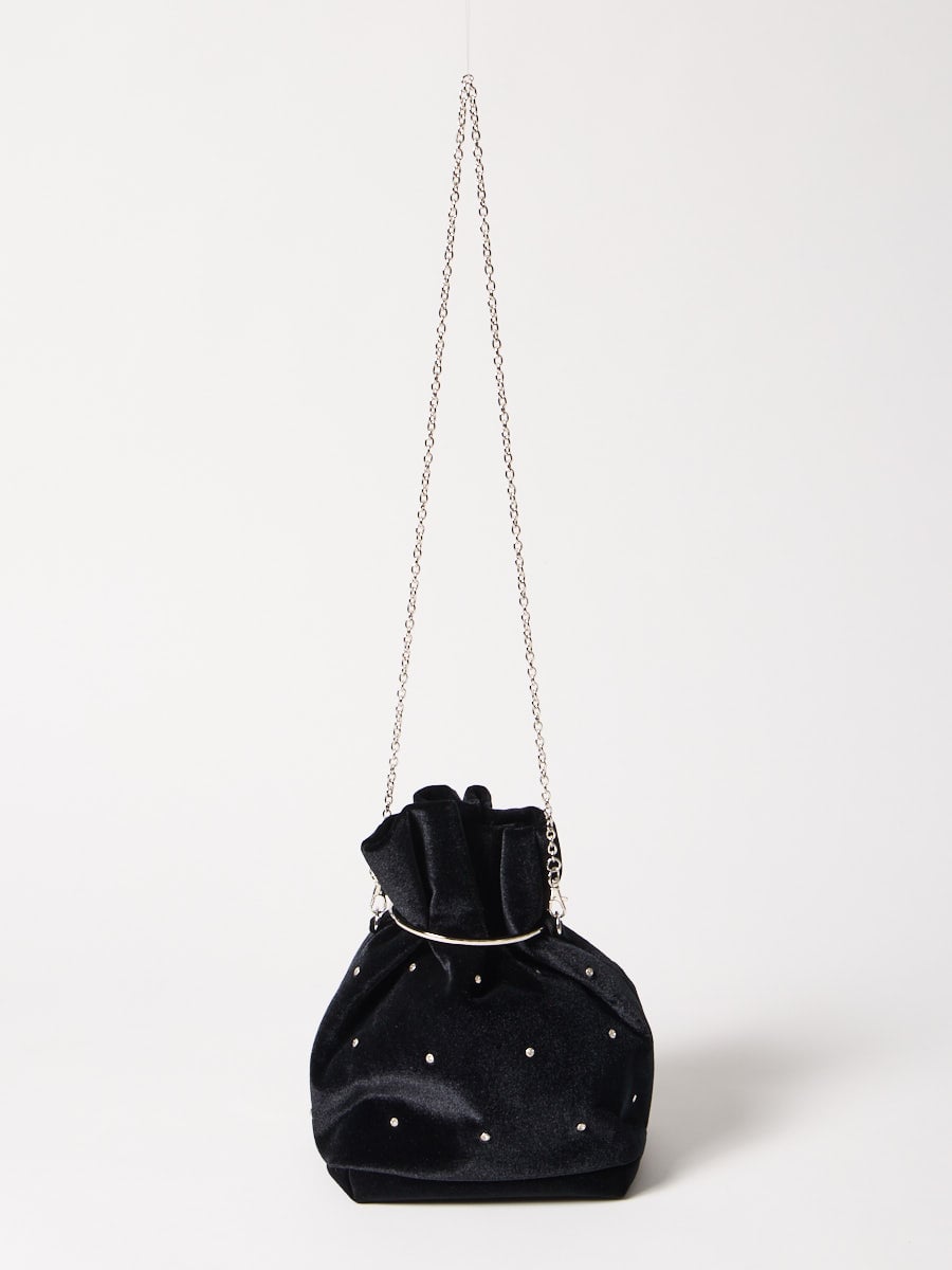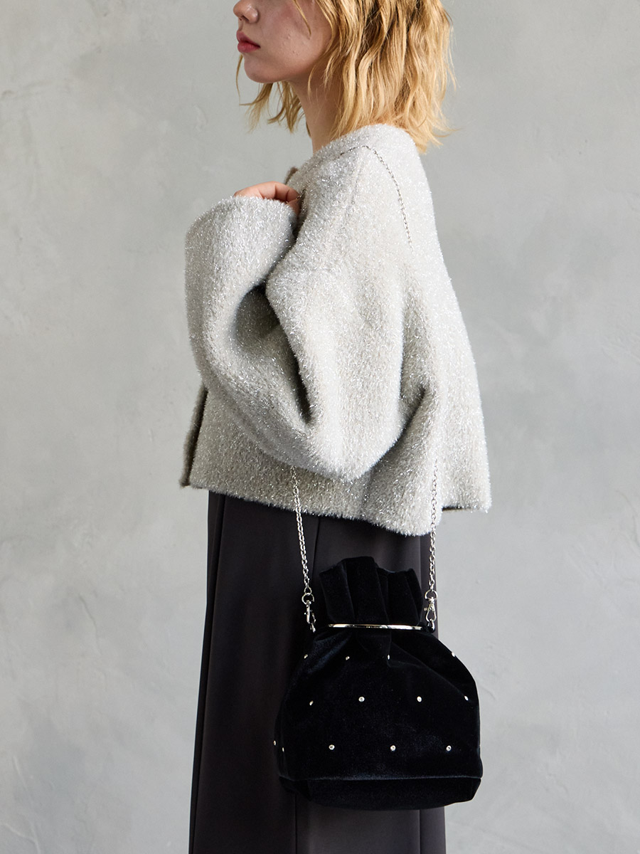 きらめくビジューがアクセントになった、巾着バッグ。ふんわりとしたベルベット素材の質感がさらに愛らしさをプラス。
