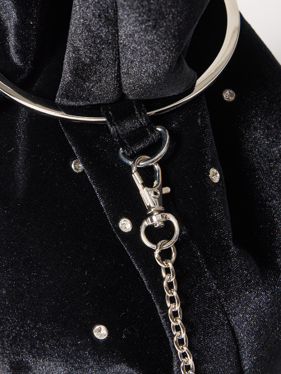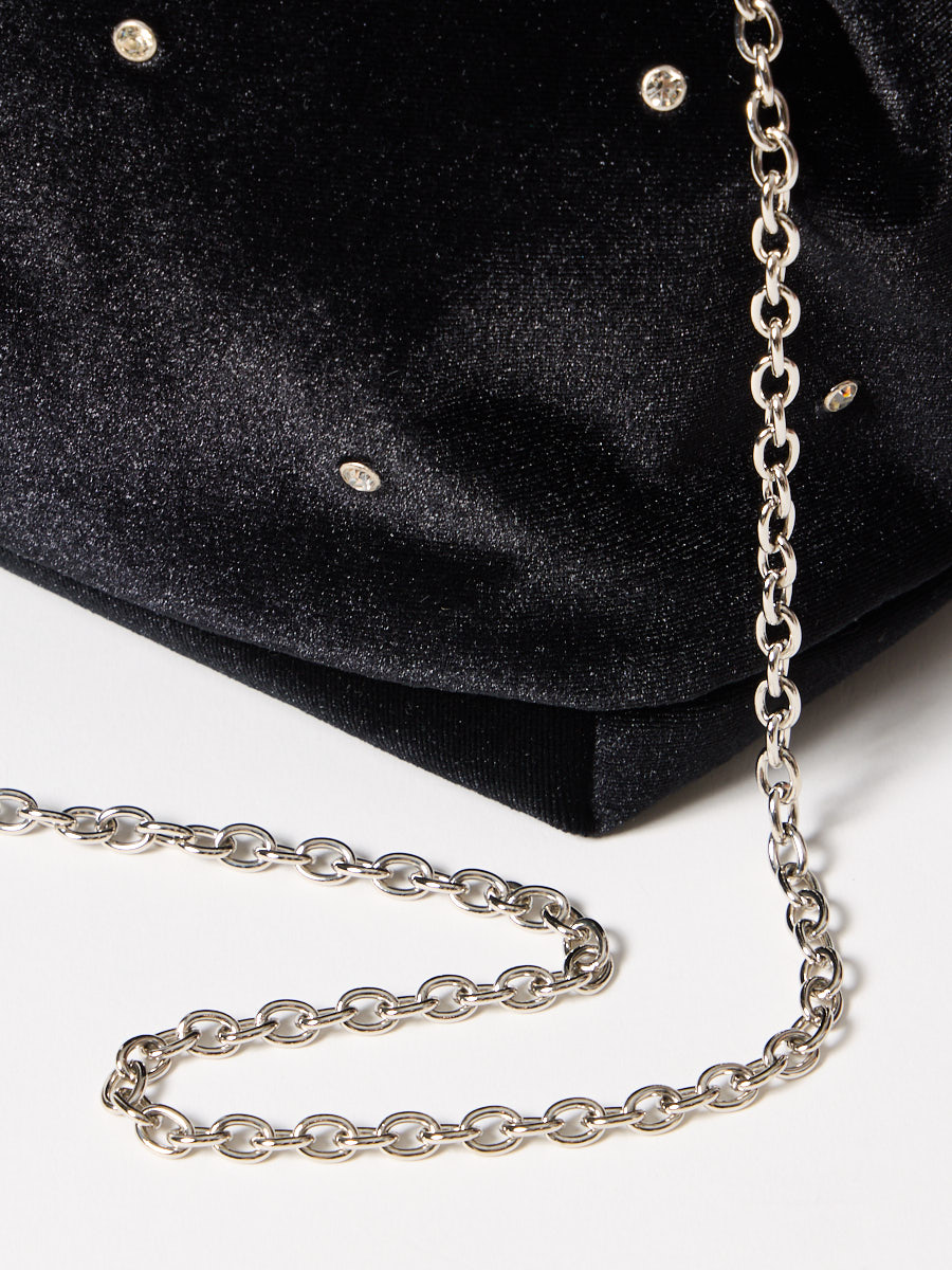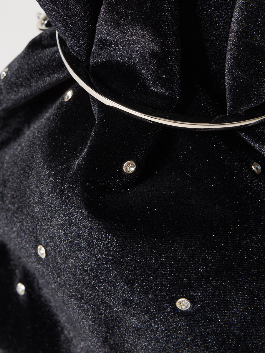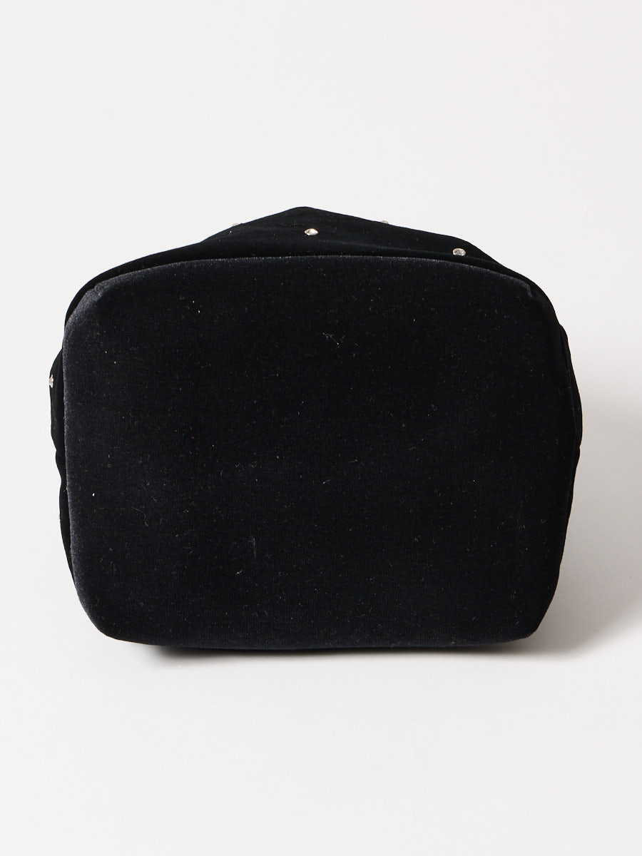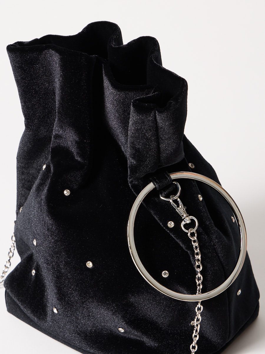 きらめくビジューがアクセントになった、巾着バッグ。ふんわりとしたベルベット素材の質感がさらに愛らしさをプラス。