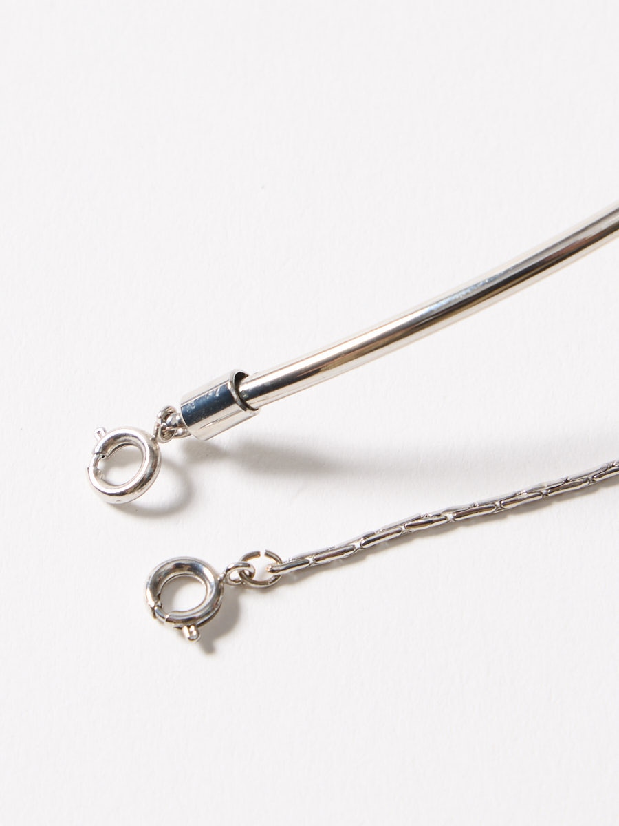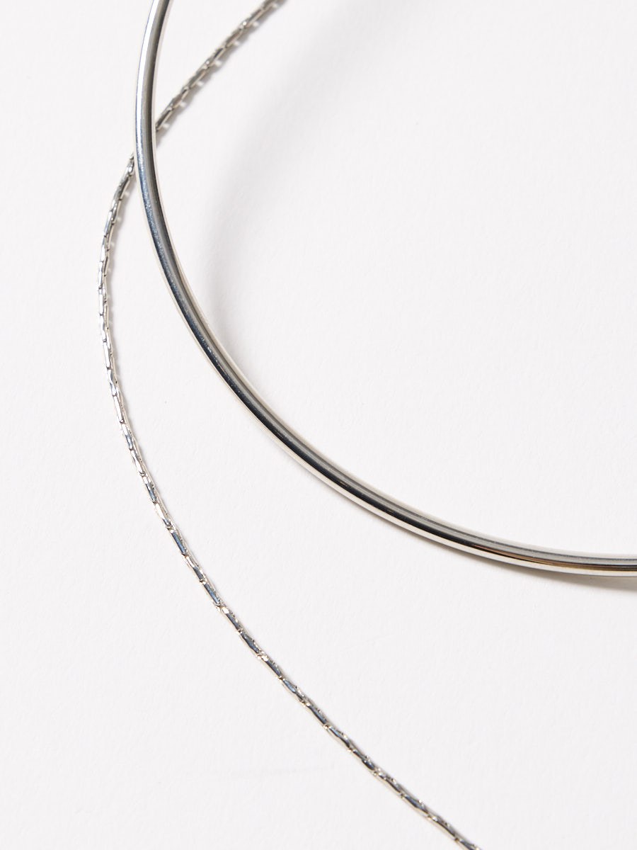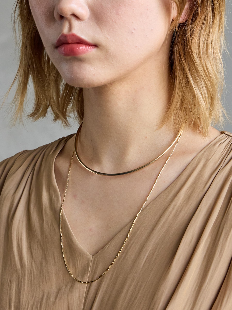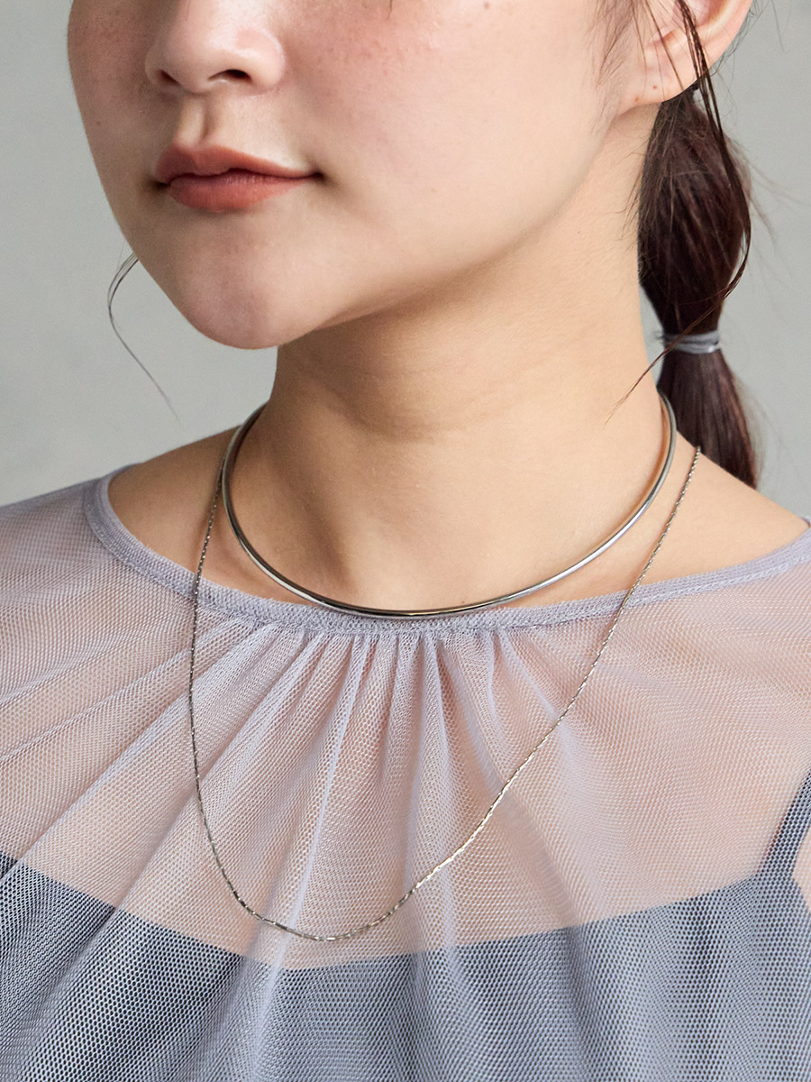 シンプルなパイプネックと華奢なチェーンを組み合わせたネックレス。