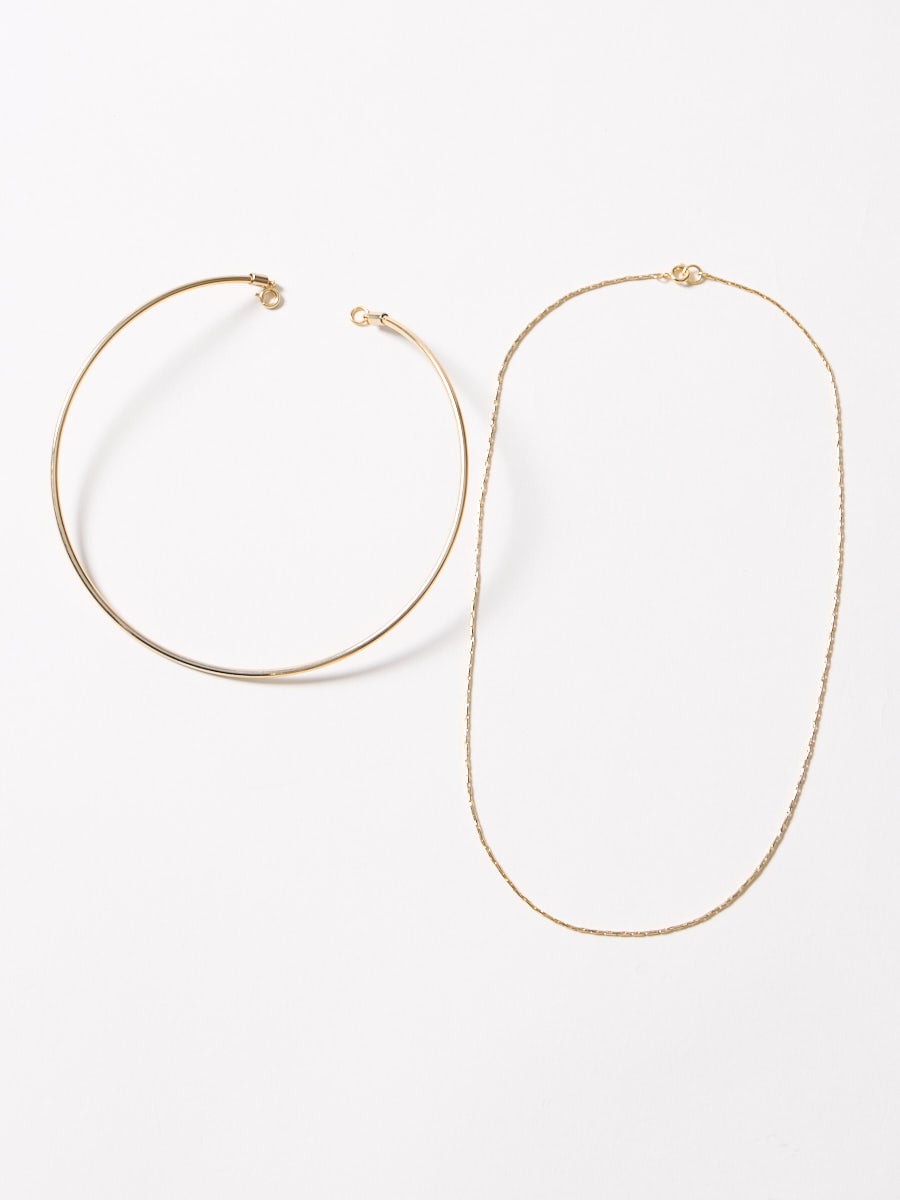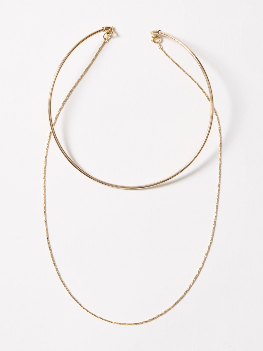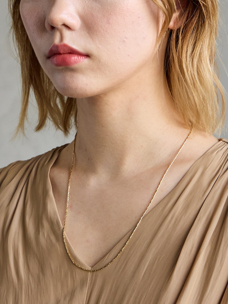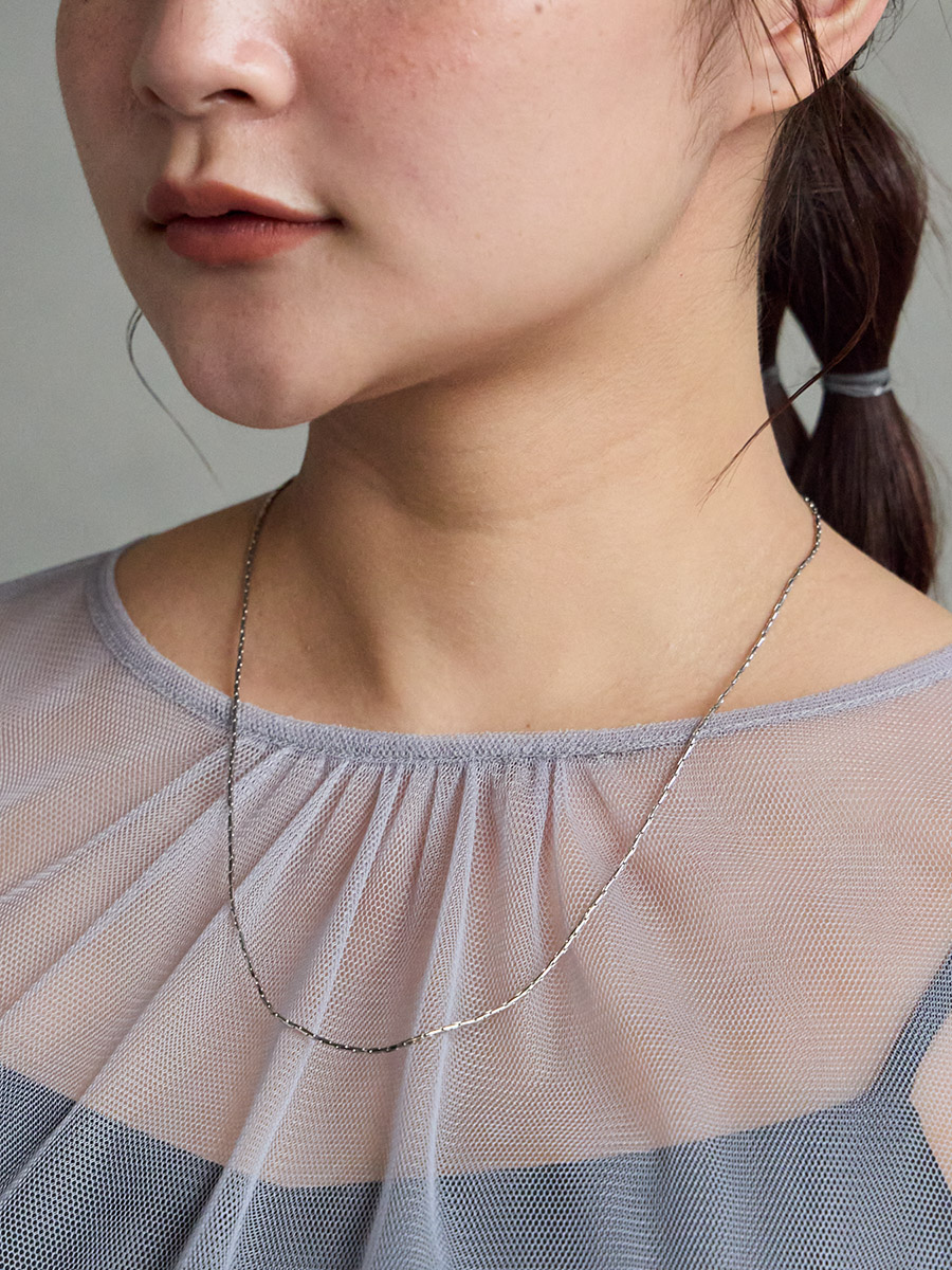 シンプルなパイプネックと華奢なチェーンを組み合わせたネックレス。