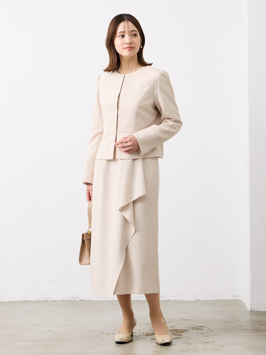 シンプルなノーカラーが顔周りをすっきりと見せ、ウエスト切り替えがメリハリのあるシルエットに見せてくれます。