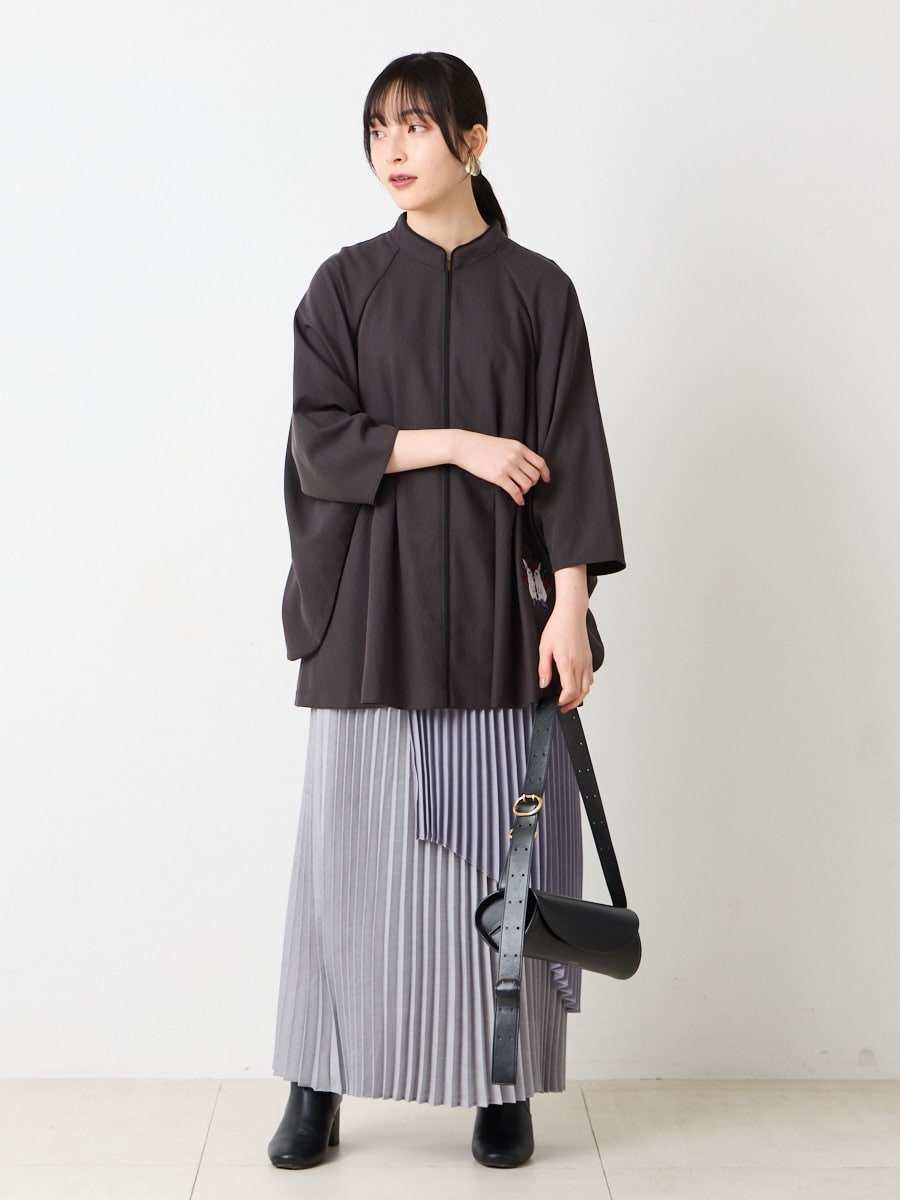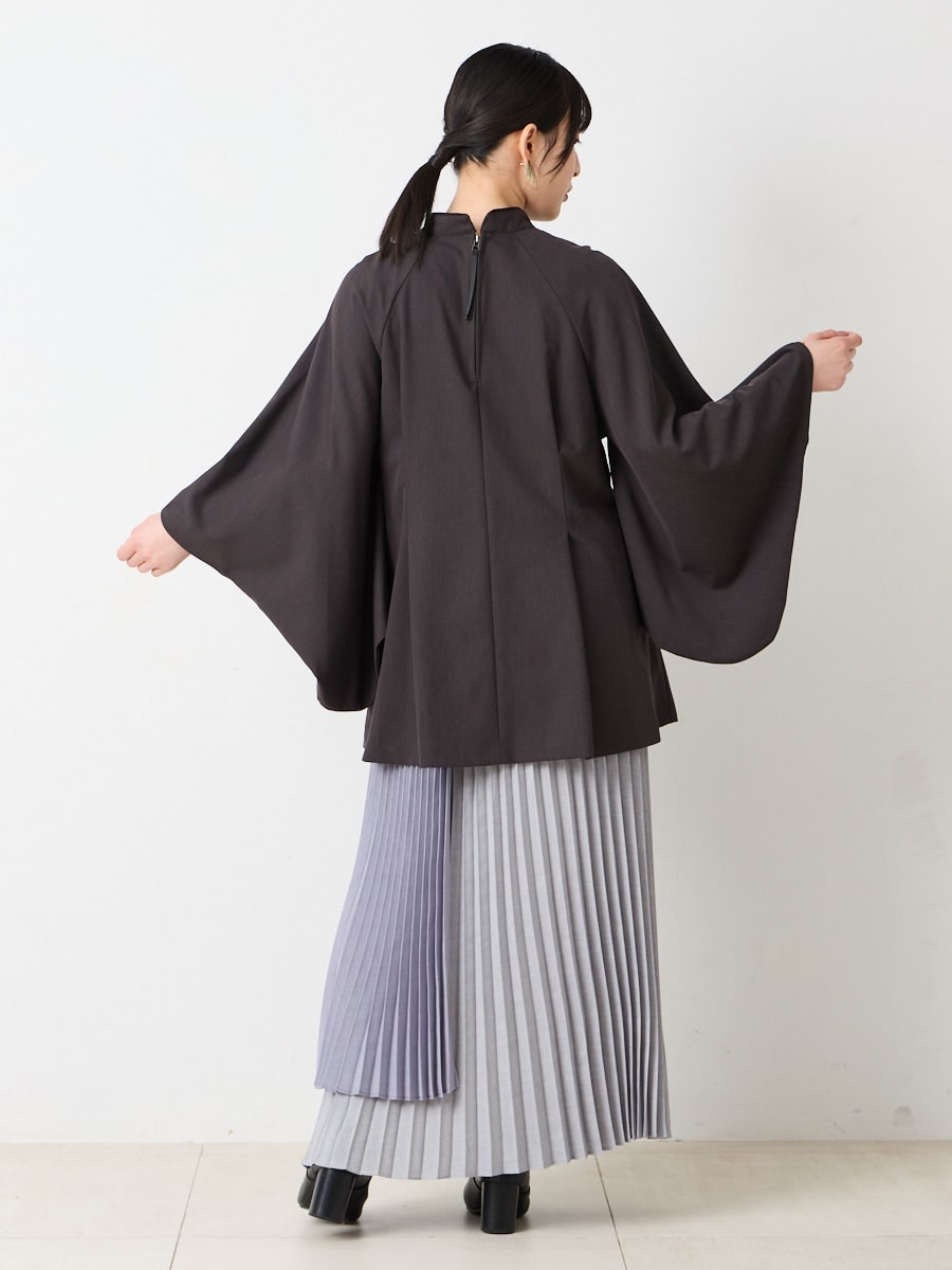 生地には、中肉のT/R(ポリエステル×レーヨン)生地を使用。硬すぎず、かといって柔らかすぎない絶妙な落ち感が、着物風の構築的なシルエットを美しく引き立てます。