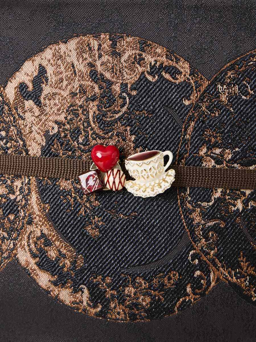 「TEA TIME」半巾帯のチョコレートの柄から飛び出たようなモチーフの帯留です。
