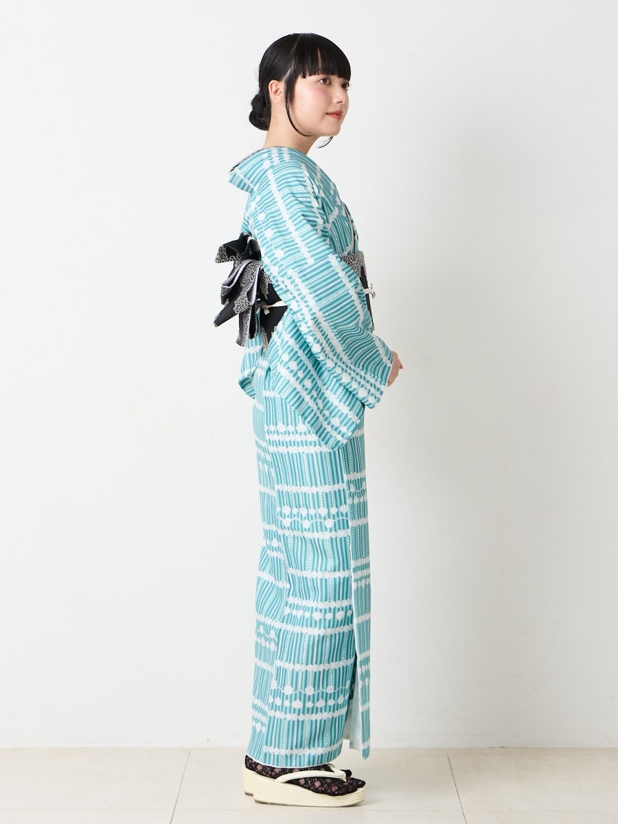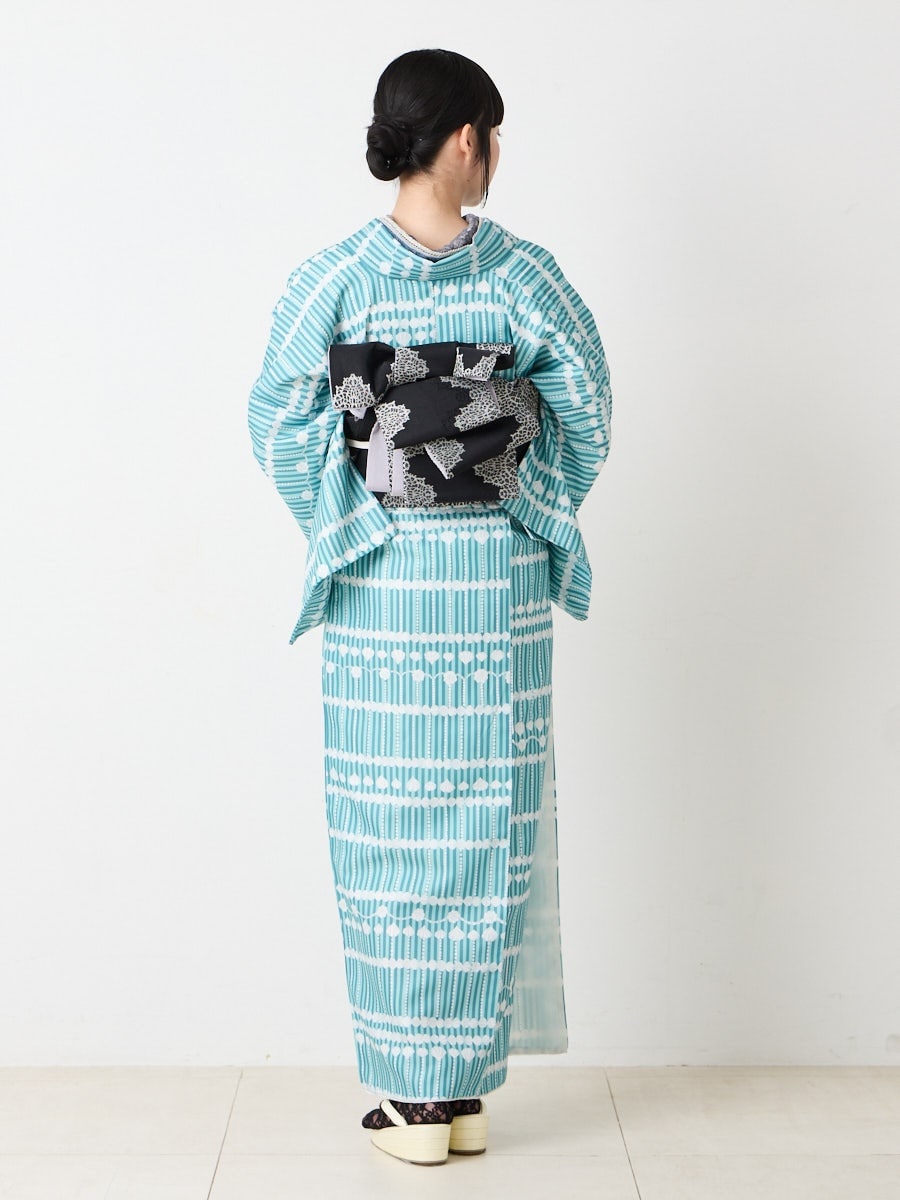 実際に袖を通すと、柄の縦ラインがすっきりとしたシルエットを演出し、自然と上品なスタイルアップ効果を感じられます。