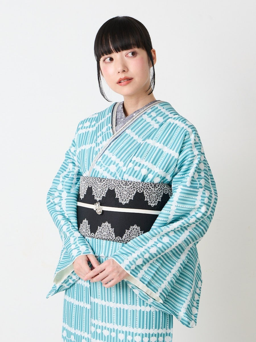 深い黒に赤い実を灯すサクランボのきものは、甘さの奥にわずかな憂いを忍ばせて。