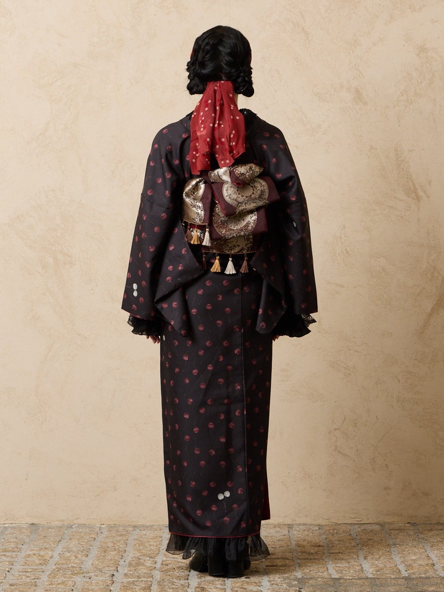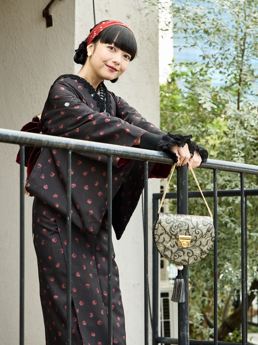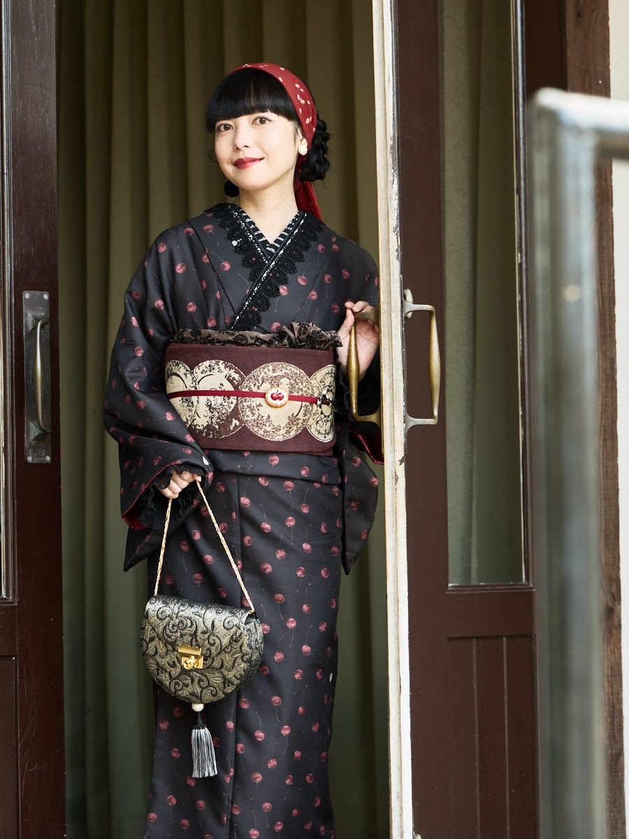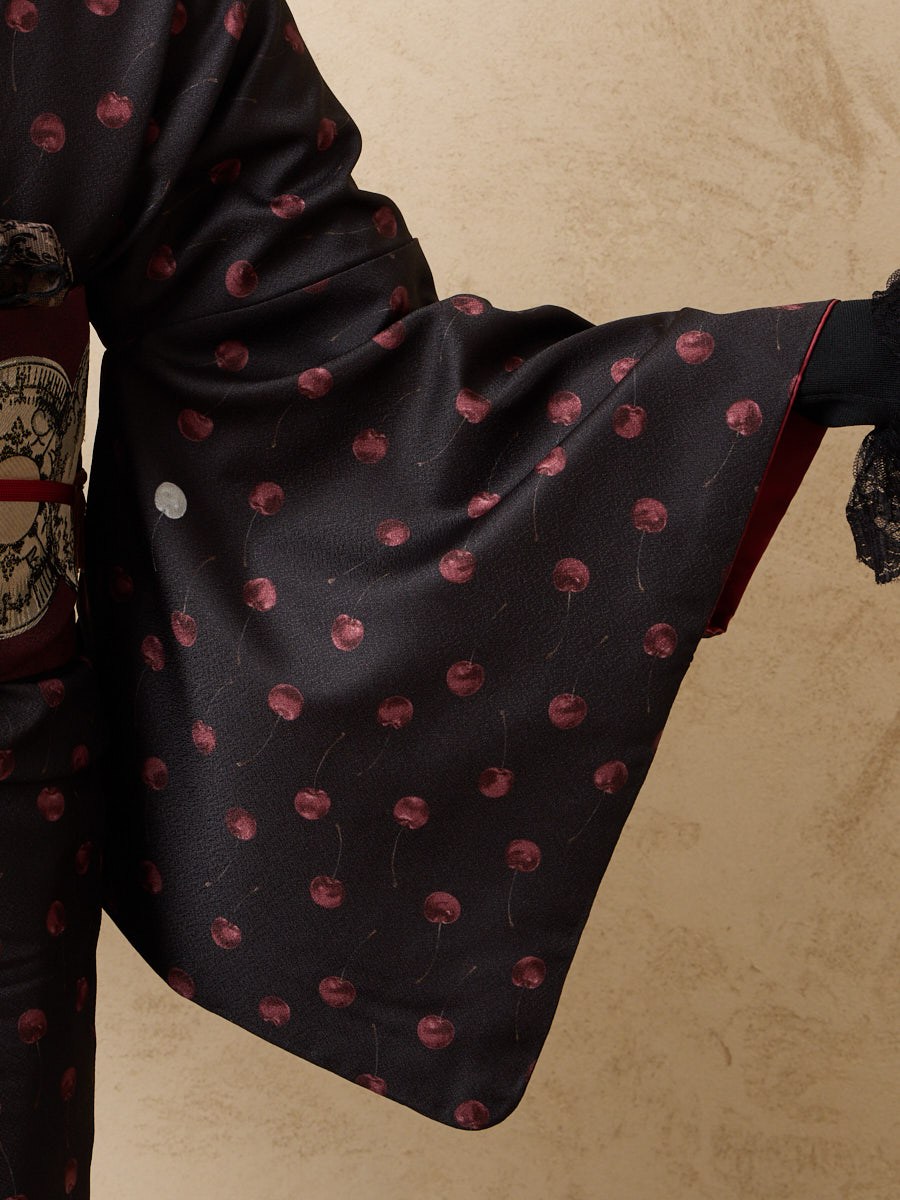 深い黒に赤い実を灯すサクランボのきものは、甘さの奥にわずかな憂いを忍ばせて。