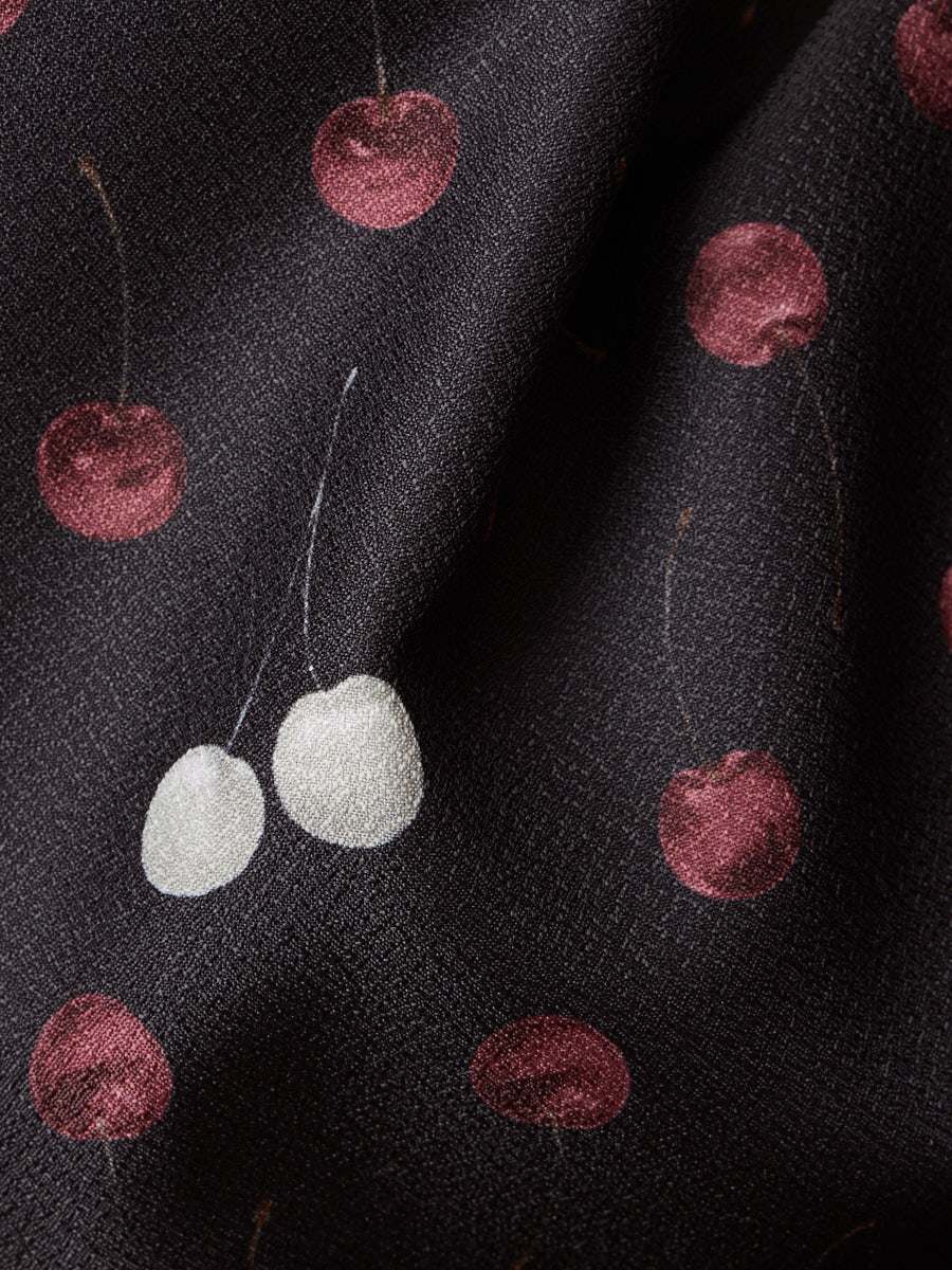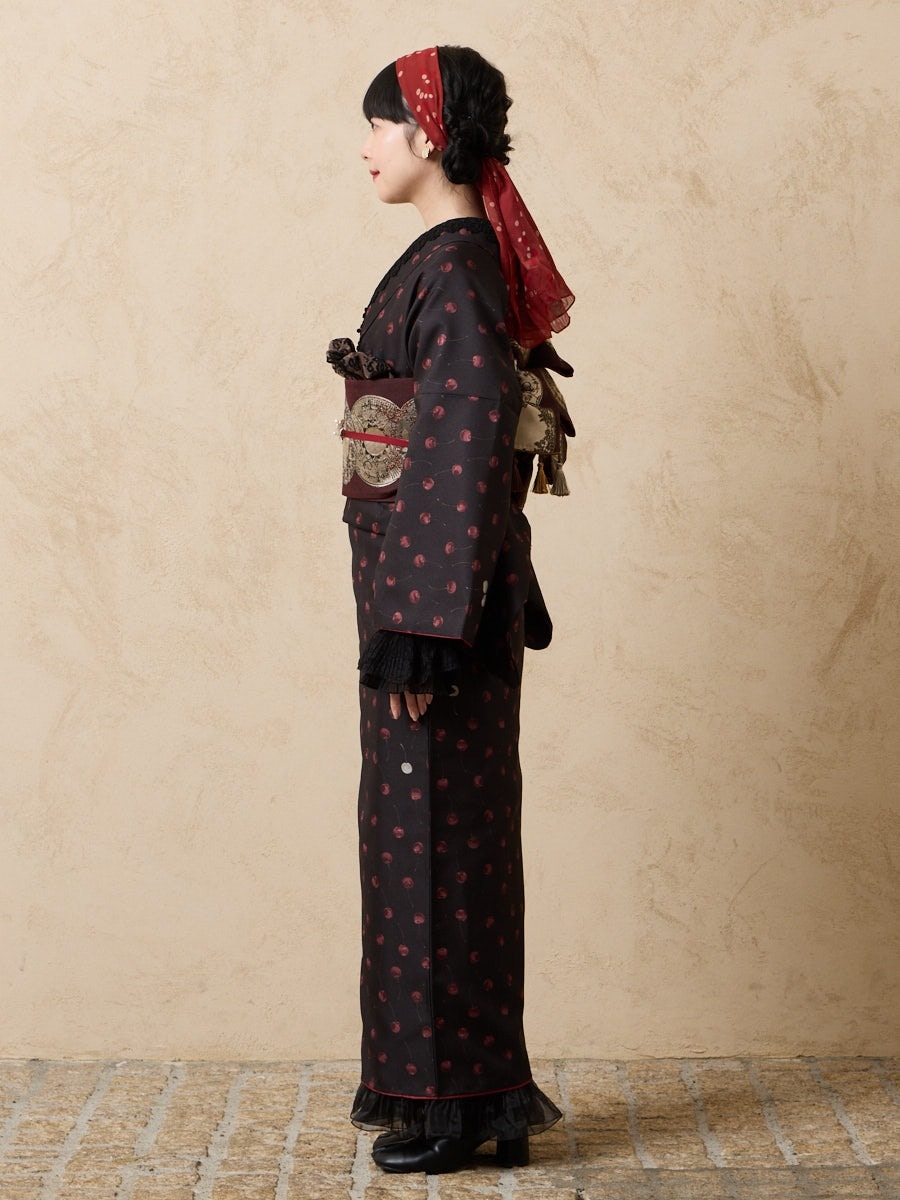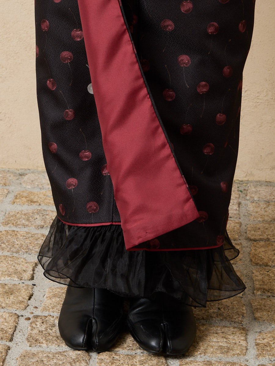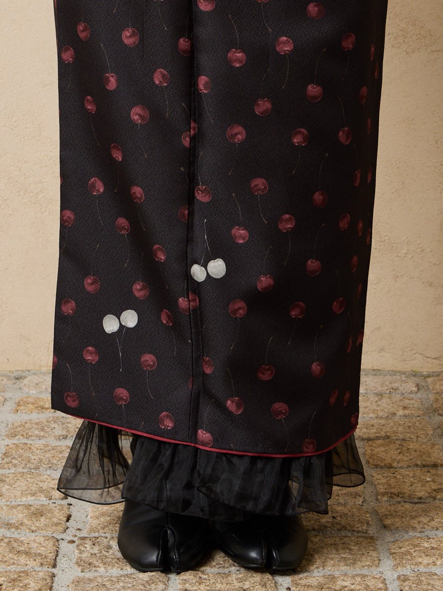 深い黒に赤い実を灯すサクランボのきものは、甘さの奥にわずかな憂いを忍ばせて。